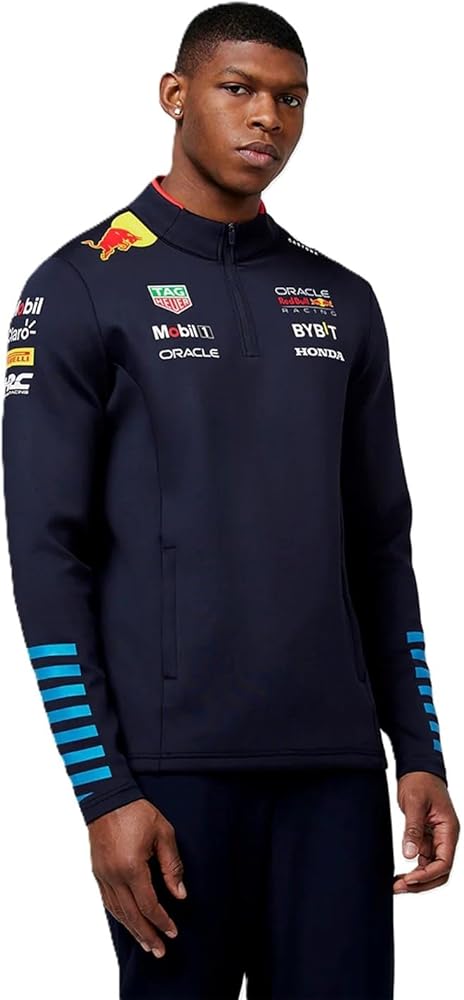 Red Bull Racing F1 Men's 2024 Team 1/4 Zip Midlayer- Navy The official 2024 Red Bull Racing Team 1/4 Zip Midlayer, designed and produced by Castore. The Team 1/4 Zip Midlayer showcases all the official Red Bull Racing team and sponsor branding from the 2024 F1 season and provides additional coverage to protect from the elements. Four-way stretch soft scuba fabric, Funnel neckline, Set-in long sleeves, Centre front quarter zip, Side pockets, Screen-printed graphic at back, Branding at chest, arms, and back. Material: 86% polyester, 14% elastane