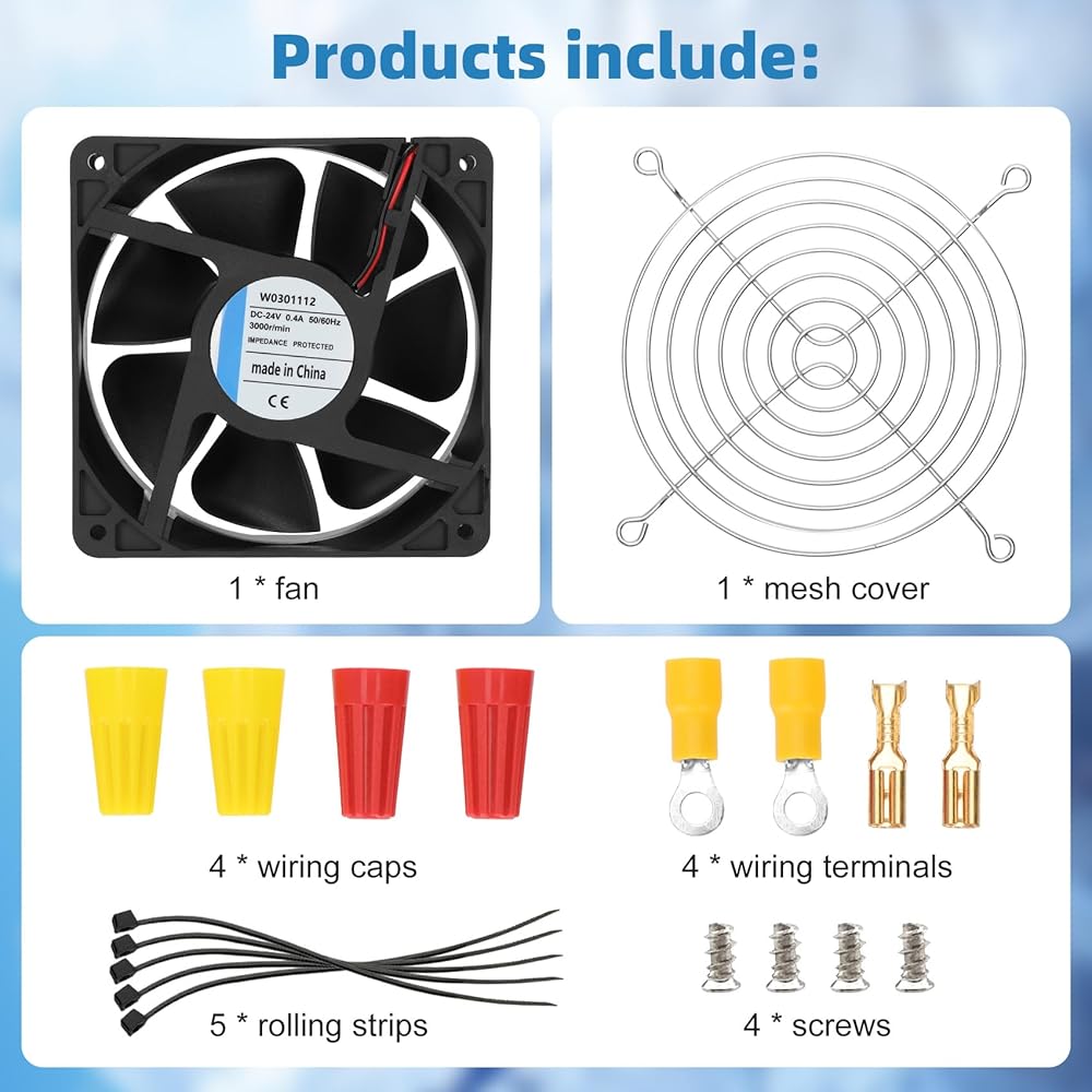 【Product specifications and packaging】 Fan motor replaceable part number: W0301112 W0301101. fan motor W0301112 is ball bearing, DC24V, 0.4A, 50/60Hz, 3000r/min. fan motor W0301112 includes 1*fan, 1*mesh cover, 5*roll bar, 4*screws, 4*wiring cap, 4*wiring terminals