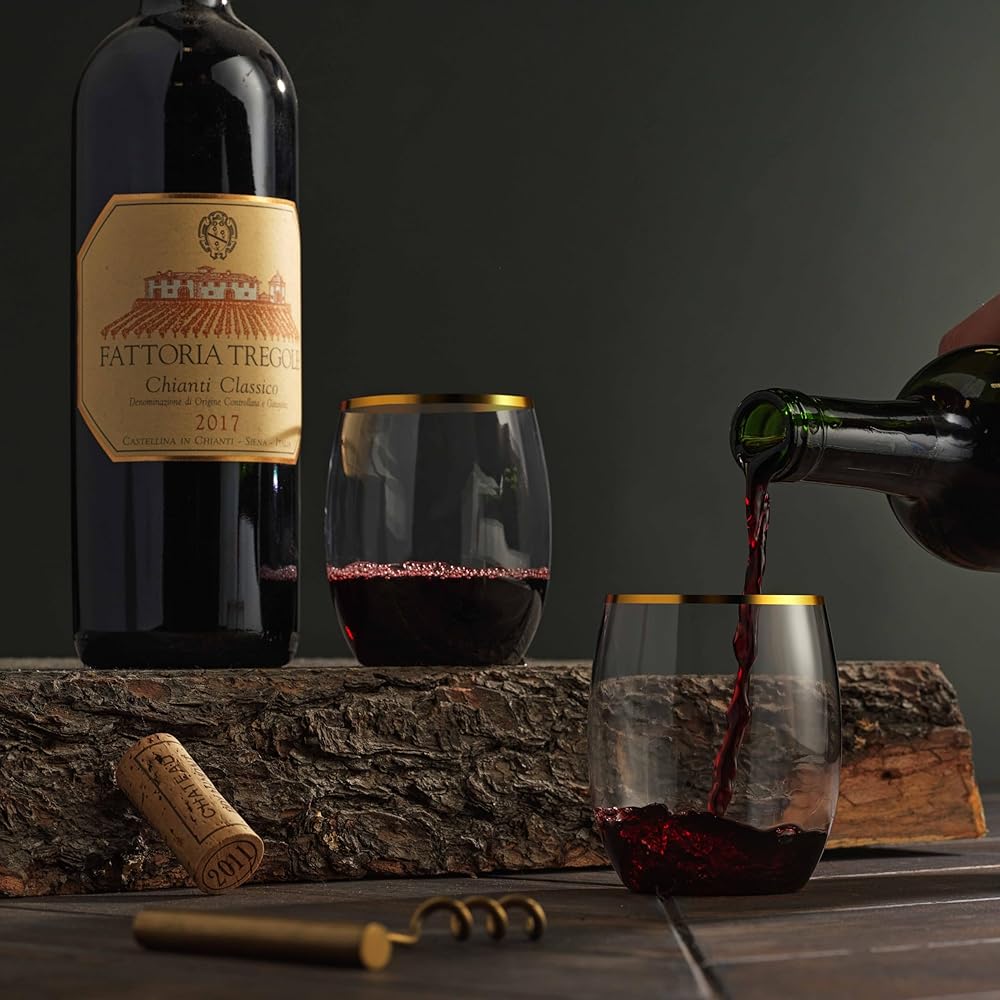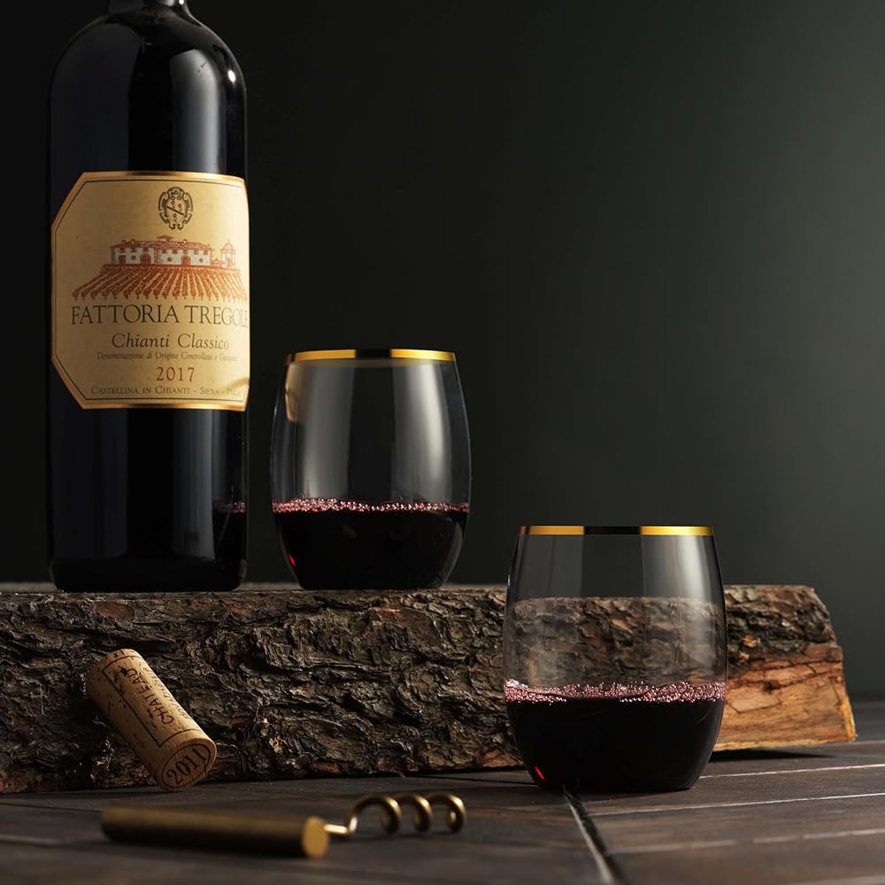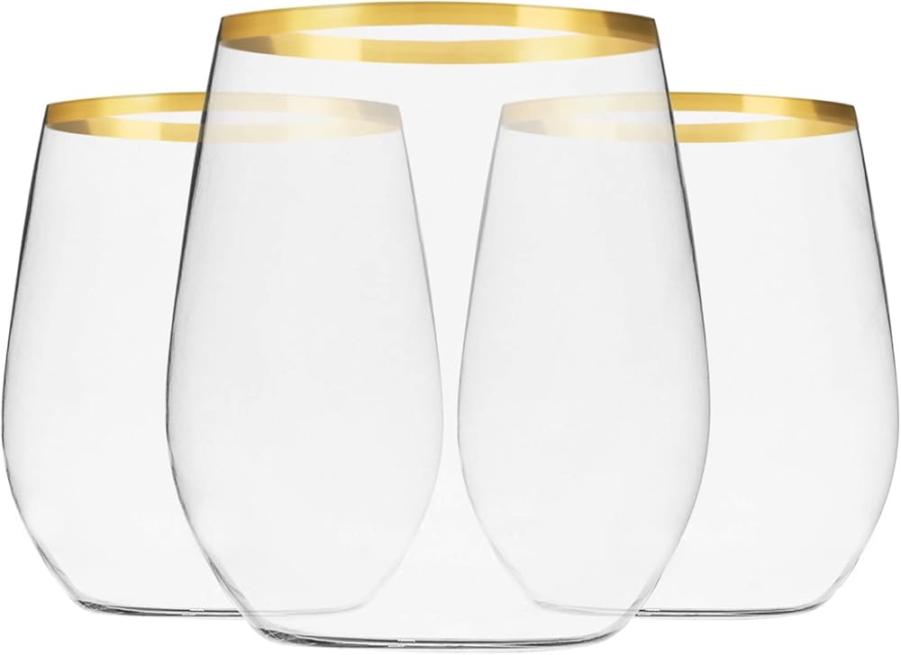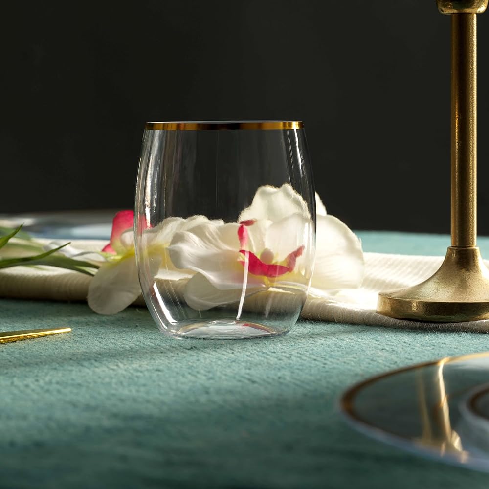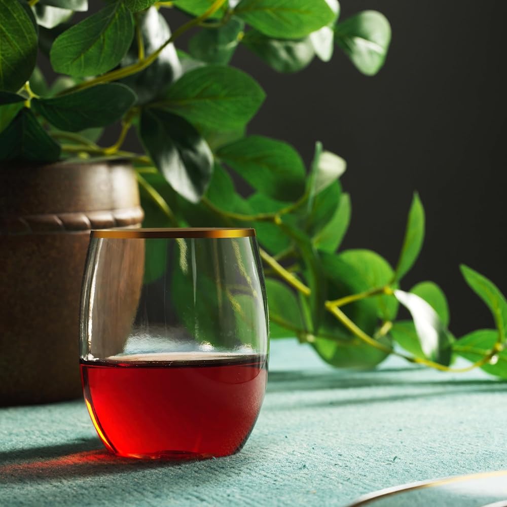 Add Elegant to your party with the MUNFIX GOLD RIMMED PLASTIC STEMLESS WINE GLASSES TUMBLERS