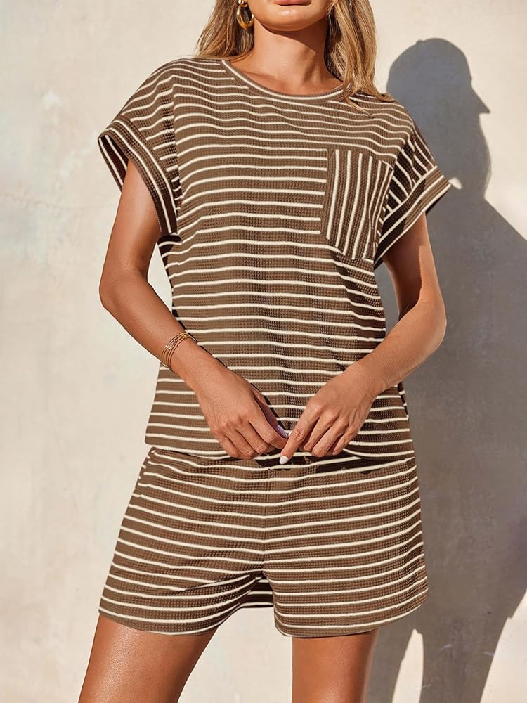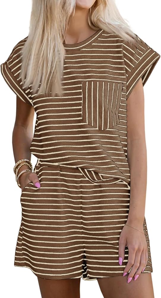 Design: The womens loungewear set designed with a chic short cap sleeve tops, pullover crew neck, striped color block, loose fit shorts with elastic high waist and pockets on both sides, which providing a stylish and cozy fit