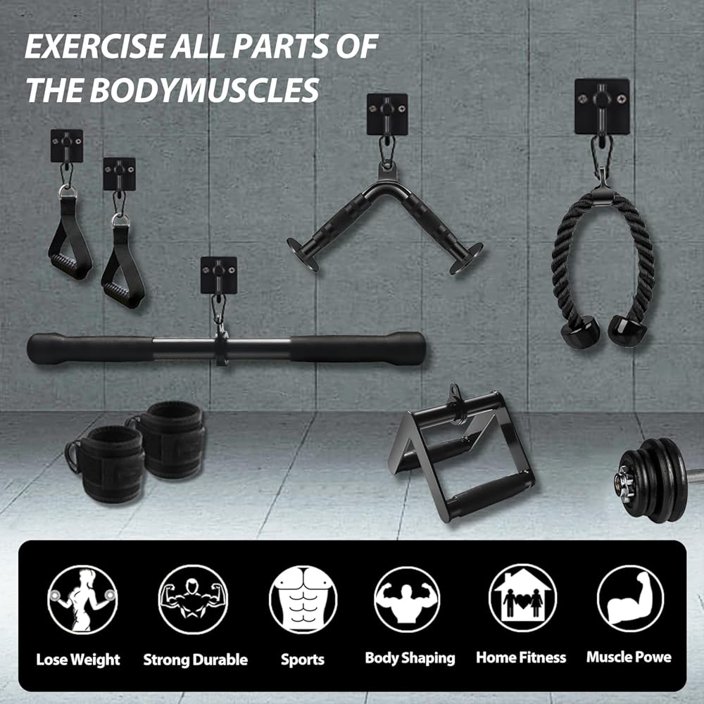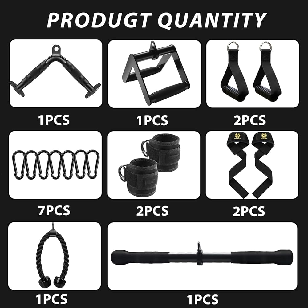 Package Includes - 1 * V-Shaped Bar +1 * Straight Rotaing Bar + 1 * V Handle with Rotation + 1* Nylon Braided Tricep Rope+2 *Ankle Straps+ 2*Cable Machine Handles+ 7*Snap Hooks+ 2*Lifting Wrist Straps.