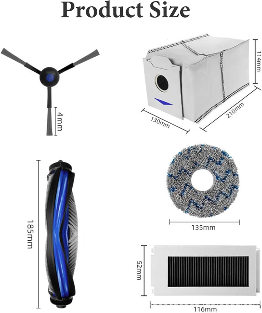 Package Included: 1 Main Roller Brush, 4 Side Brushes, 4 Mop pads, 2 HEPA Filters 3 Dust Bags. It is recommended to replace these every 3-6 months