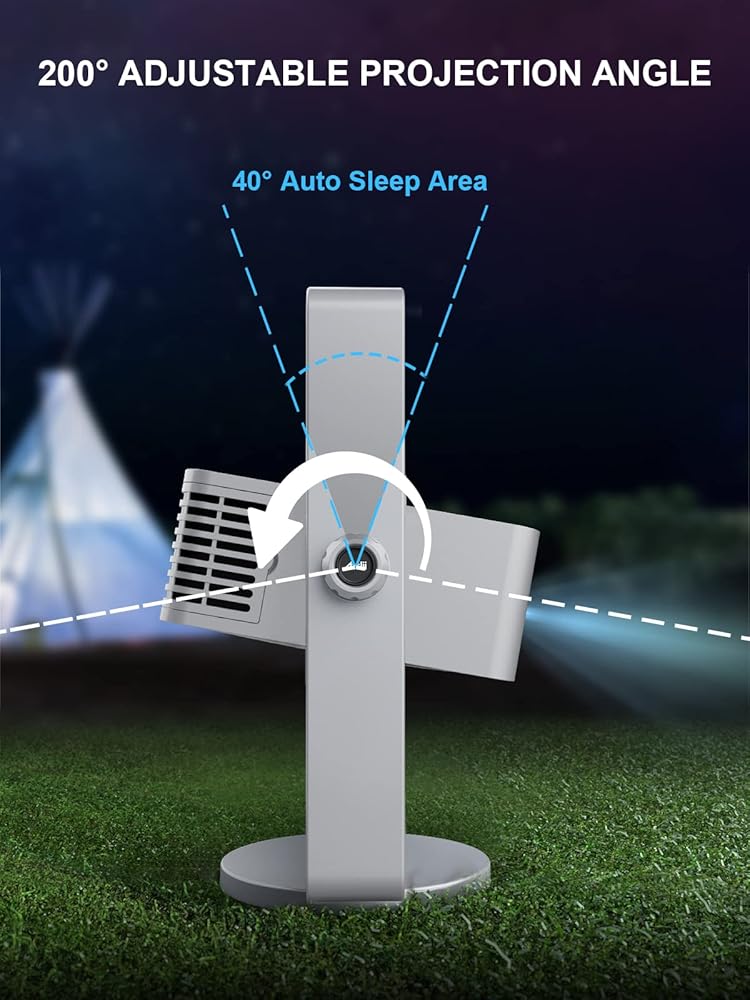 Equipped with Stand & Improve Movie Viewing Experience - The outdoor projector is equipped with a stable round base, avoiding the trouble of multiple manual adjustments due to the instability of the projector. In addition, with a 200°rotatable button, you can adjust to your desired projection angle at any time according to your needs, effectively improving your viewing experience.