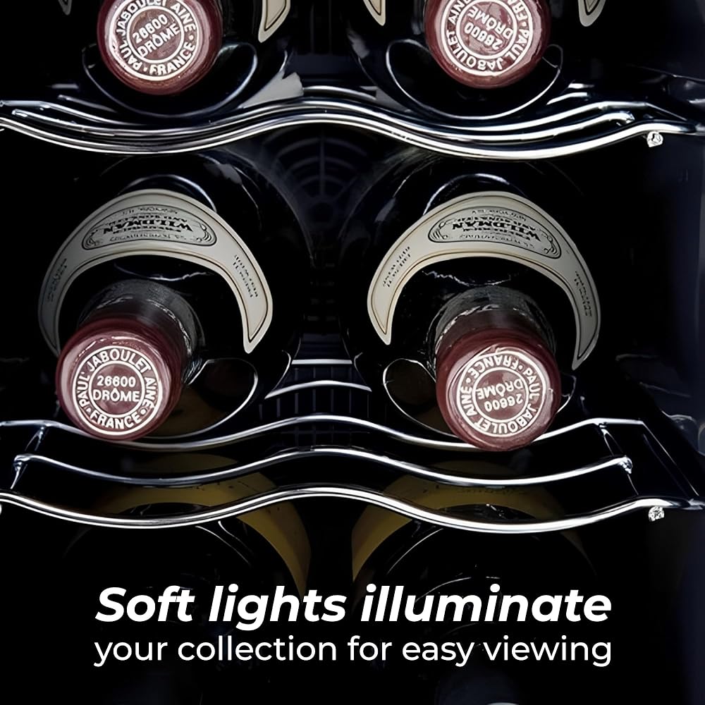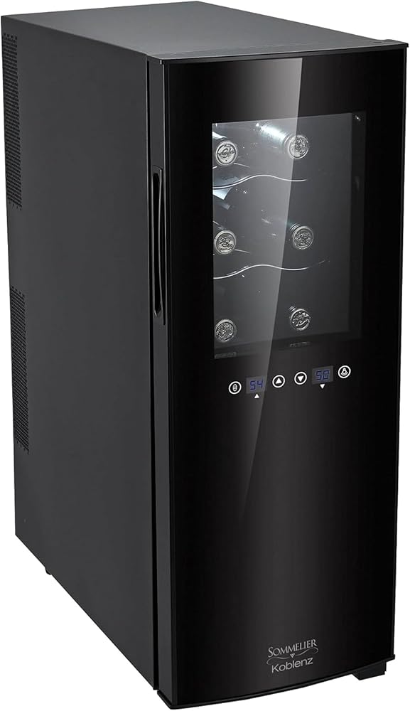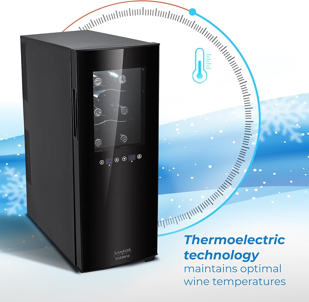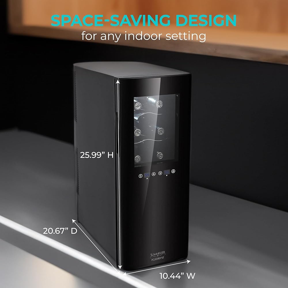Looking for a classic wine cooler? Try Koblenz free-standing single zone 6-Bottle Wine Cooler and Mini Fridge, which features a sleek black finish with touch controls. The thermoelectric cooling system of our wine fridge keeps the temperature stable and your wine looking and tasting its best. The wine cooler will keep your wine perfectly chilled for up to 87 hours on its high setting and 95 hours on its low setting, so you can enjoy your wine at any time. Designed to provide an optimal storage environment for your wine collection, our mini fridge features three wide T4 chrome racks, perfect for storing up to six 750 ml wine bottles. Measuring 14.18" H x 10.44" W x 20.67" D, this wine cooler is great for apartments, kitchens, or homes with limited storage space. The refrigerator's compact size makes it easy to move around, so you can place it in different locations as and when needed. If you're a wine connoisseur or someone who enjoys a good glass of wine, this quick and energy-efficient mini fridge is perfect for you.