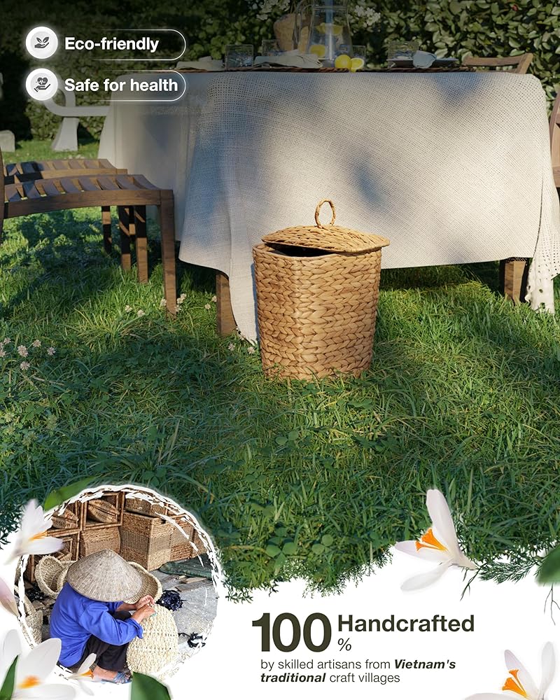 🌿 Handcrafted from Natural Water Hyacinth: Made from 100% natural and eco-friendly water hyacinth, this wastebasket is expertly handwoven by skilled Vietnamese artisans, combining traditional craftsmanship with sustainability.