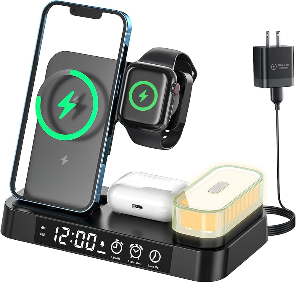 【5 in 1 Foldable Wireless Charging Station】Featuring a 4 in 1 30W Fast wireless charging stand, a digital alarm clock & an adjustable 7-colour portable night light, you can charge your phone, AirPods and iwtach at the same time. Buy a Hdiwousp multi-device wireless charger stand to get rid of messy charging cables on your desktop and make your desk and nightstand neat and organized.