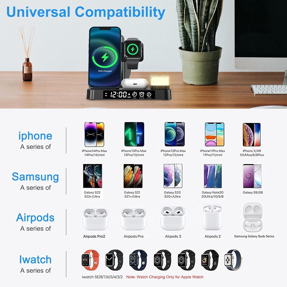 【30W Safety Fast Charging】Equipped with security 30W fast wireless charger, compatible with iPhone 14/14pro/13Pro Max/13/12/12 Pro / 11 Pro Max / XR / X / XS / XS MAX / 8Plus/,compatible with Samsung Galaxy Note 9/8/7/5, S20 /S10 / S10 Plus / S9 / S9 Plus / S8 / S8 Plus / S7 / S7 edge etc. You can charge your headphones that support wireless charging with this wireless charging station, such as AirPods 2/AirPods pro/AirPods 3(Not suitable for AirPods 1). The watch charger part can only wireless charge for iWatch, not support Samsung Watch and iWatch 1.