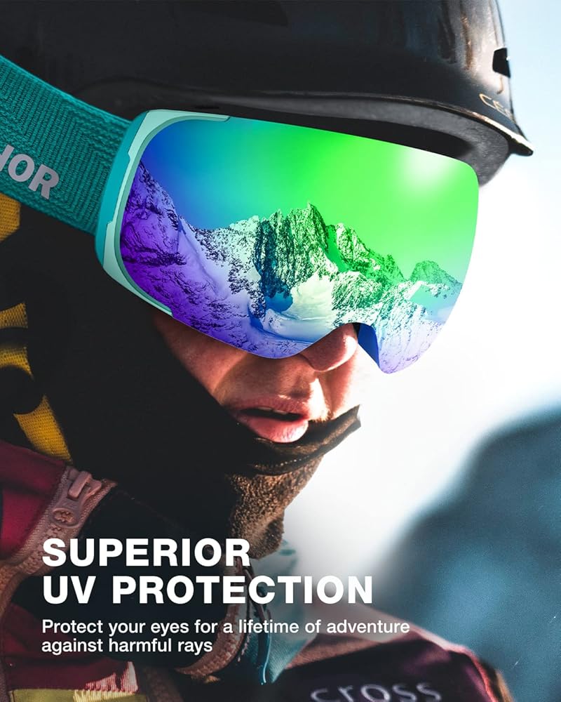 High Performance Anti-fog & UV Protection - Our snowboard goggles equip with dual-layer-lens with anti-fog treatment, and splendid venting system absorbs moisture and eliminates haze to minimize the chance of fogging and deliver crystal clear vision that lasts for an extended period of time. The skiing goggles comes with UV protection to protect your eyes against harmful UVA/UVB/UVC rays