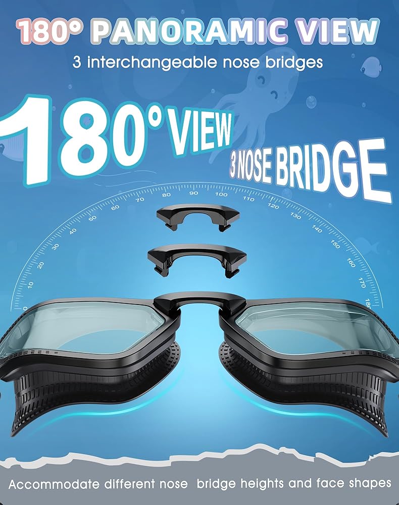 Universal Comfort with Customizable Fit✓: Suitable for all face shapes, these swim goggles for adult women men and teenagers feature an adjustable strap, ergonomic nose bridge, and three interchangeable nose pieces for a tailored, pressure-free fit.