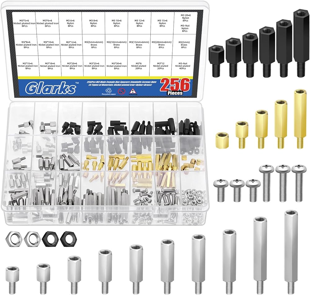 Glarks 256pcs M3 Carbon Steel & Nylon & Brass Standoff Set Hex Mount Spacer Motherboard Spacer Male-Female Spacer Standoff with Pan Head Screw Nylon Screw Nut and Hex Nut for PCB, Quadcopter Drone