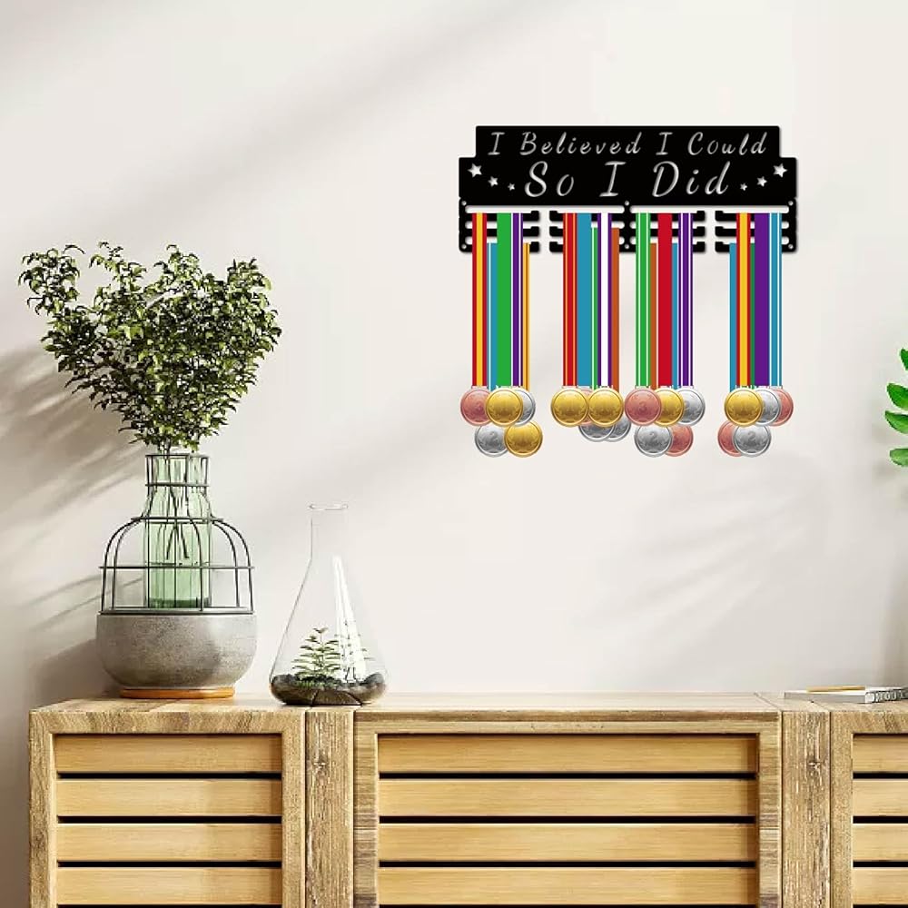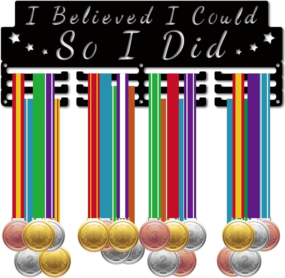 [PREMIUM IRON MATERIAL]: The metal medal display is made of premium iron material, sturdy and durable, smooth surface, no sharp edges. There are 3 rows of 12 separate holders, super loading capacity of up to 5kg/11lb, can hang more than 60 medals and has an intelligent anti-slip device.