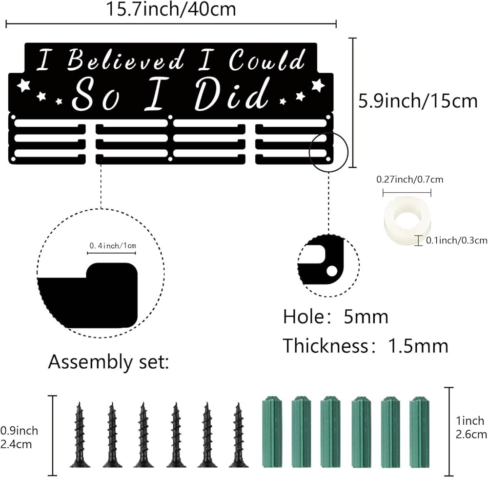 [MEDAL HOLDER SIZE]: Medal holder * 1pcs: 15.7 x 5.9 inch(40x15cm), hole: 0.2 inch(5mm), 6pcs screws and expansion pipes, with gift package box * 1pcs. Note: the white gasket is used to maintain the distance between the wall and the medal hook, making it easier to hang medals.