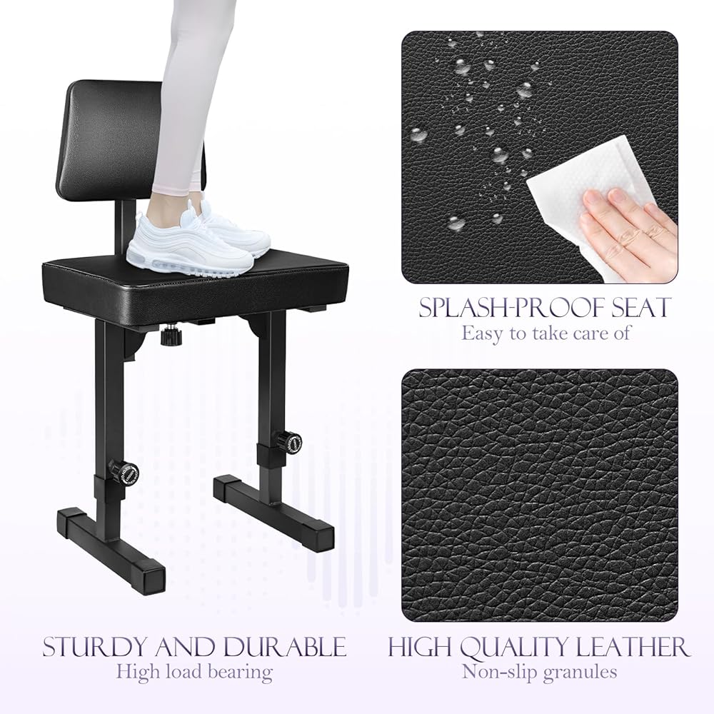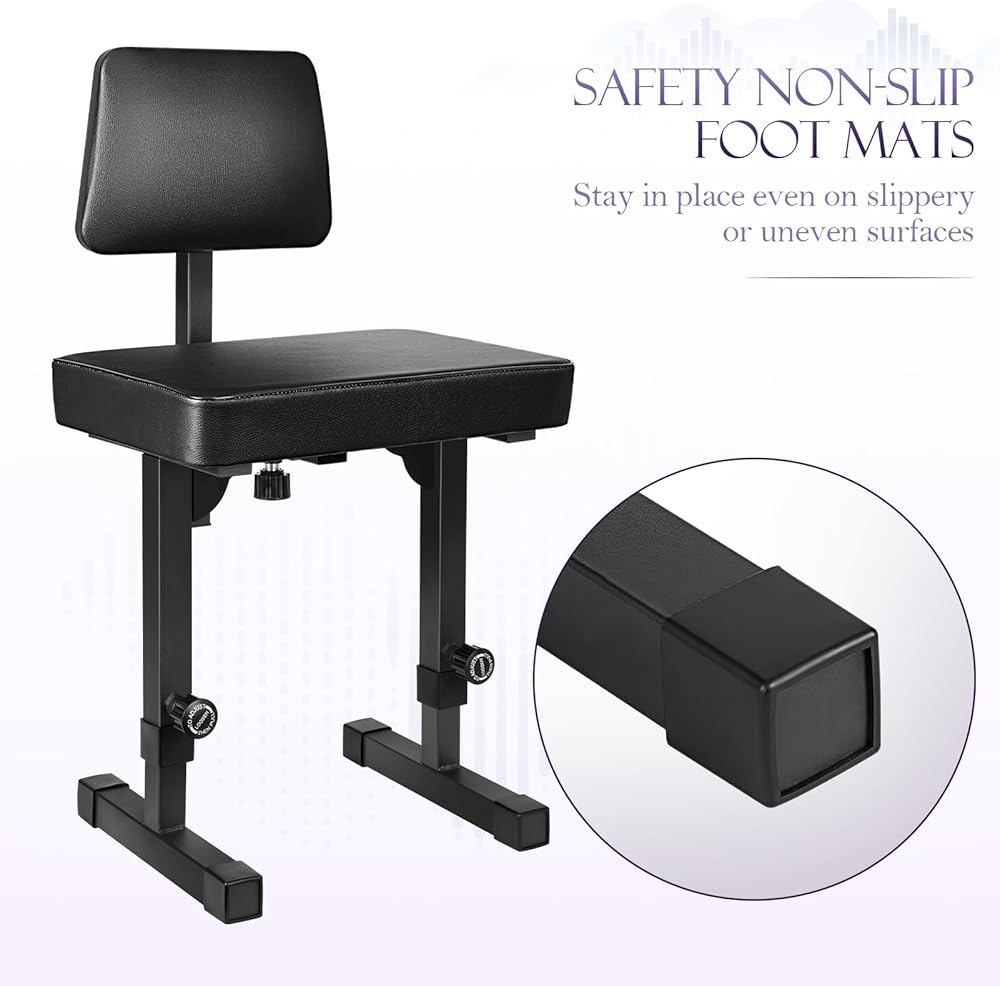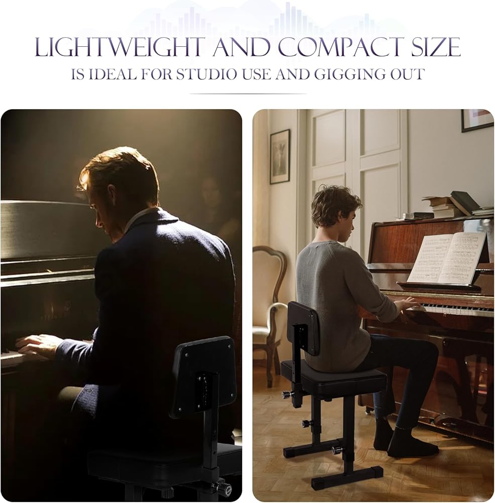 EASY TO SET UP AND TRANSPORT: The keyboard chair is lightweight and easy to carry or set up. The piano bench has two spring-loaded safety knobs on the support legs that adjust the height and hold the bench in place to avoid rapid lifting and lowering when in use, and to prevent children from pinching themselves while playing. This adjustable piano bench with backrest does not take up much space and is easy to store and transport between gigs.