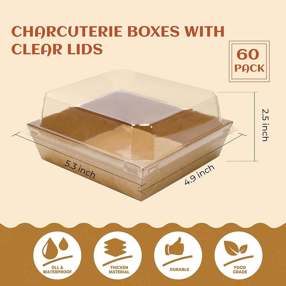 Small Charcuterie Boxes with Clear Lids Square Dessert Boxes To Go Disposable Food Containers for Cookie Sandwich Cake Slice 5.3x4.9x2.5INCH(Brown, 60 Pack)