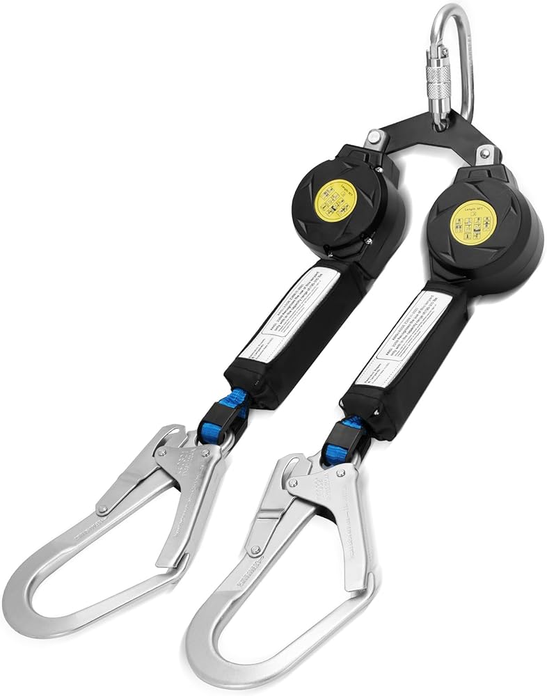 【Twist-Up Locking Buckle】Our 11ft retractable lanyard comes with a heavy-duty steel carabiner hook with a swivel top that has a double auto-locking feature that securely attaches to the D-ring on the back side of the harness or to a reliable anchor point to ensure your safety