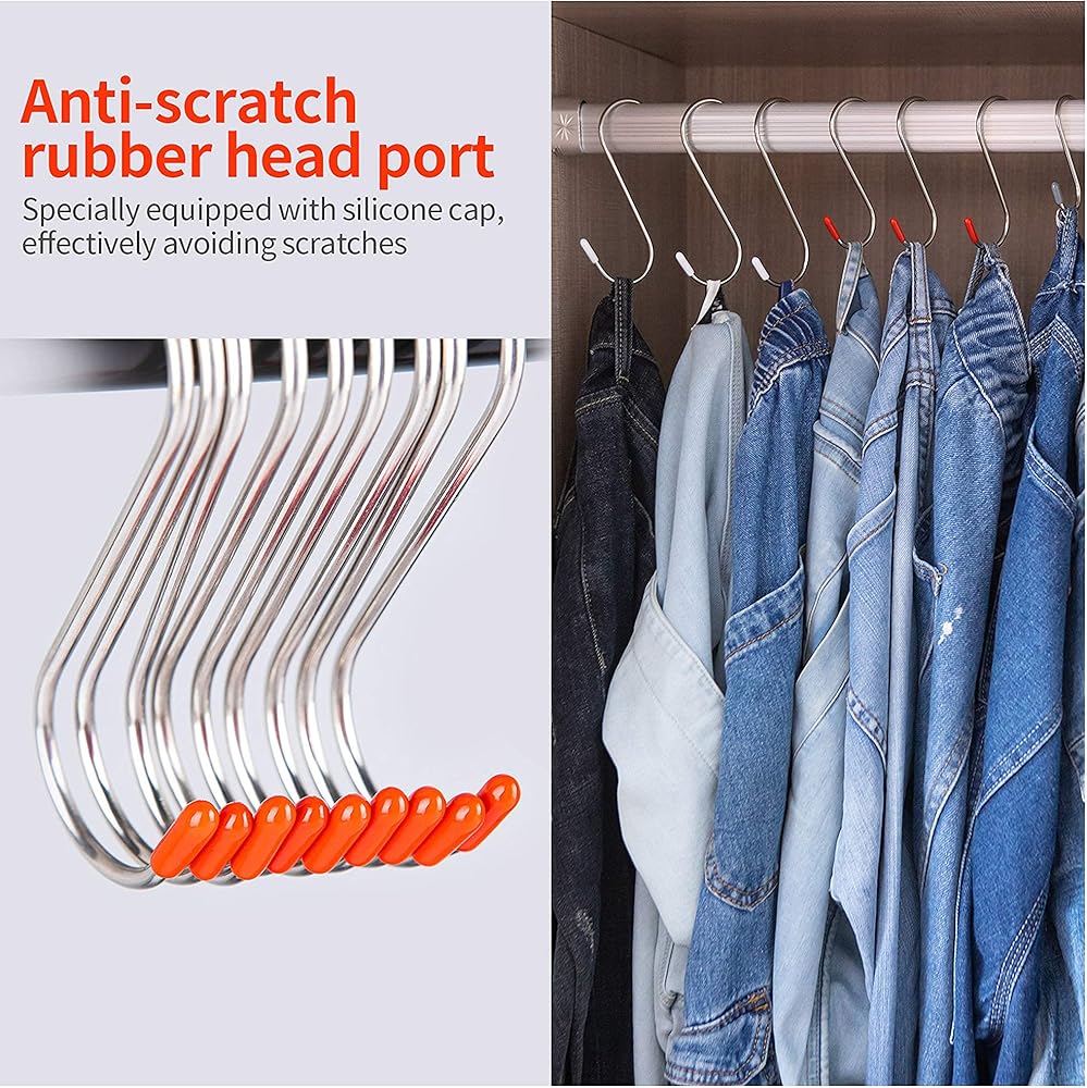 THREE AVAILABLE SIZES : The package includes three sizes s hooks ( 4.3in, 3.5in, and 2.8in ) for your selection to better adapt to different using occasions. Rubber caps are in different colors to help you quickly distinguish the size, and the ergonomic streamlined design makes your space harmonious and beautiful. The s hook can be moved freely, and it can be put in the bag when not in use, which is convenient to carry.