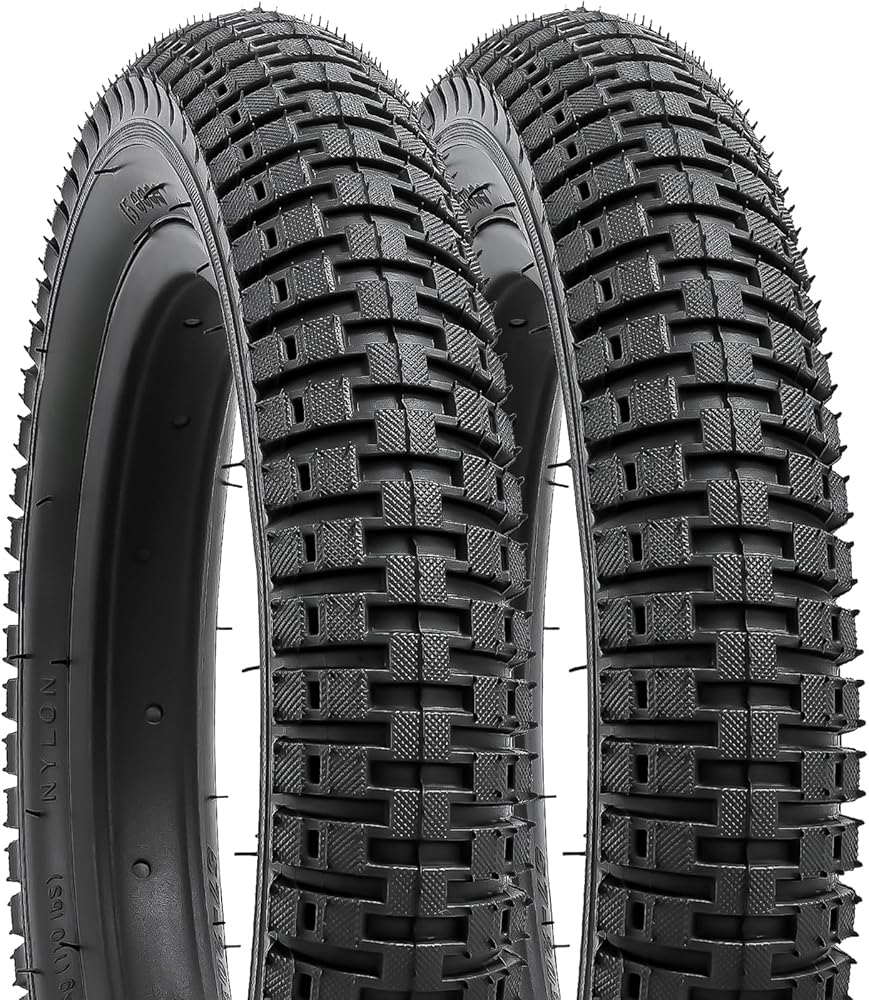 Package Includes: 2 pcs 14''X1.95'' bike tires, 2 pcs 14''X1.75/2.25 AV32mm Schrader Valve heavy duty bike tubes, 2 Rim Strips
