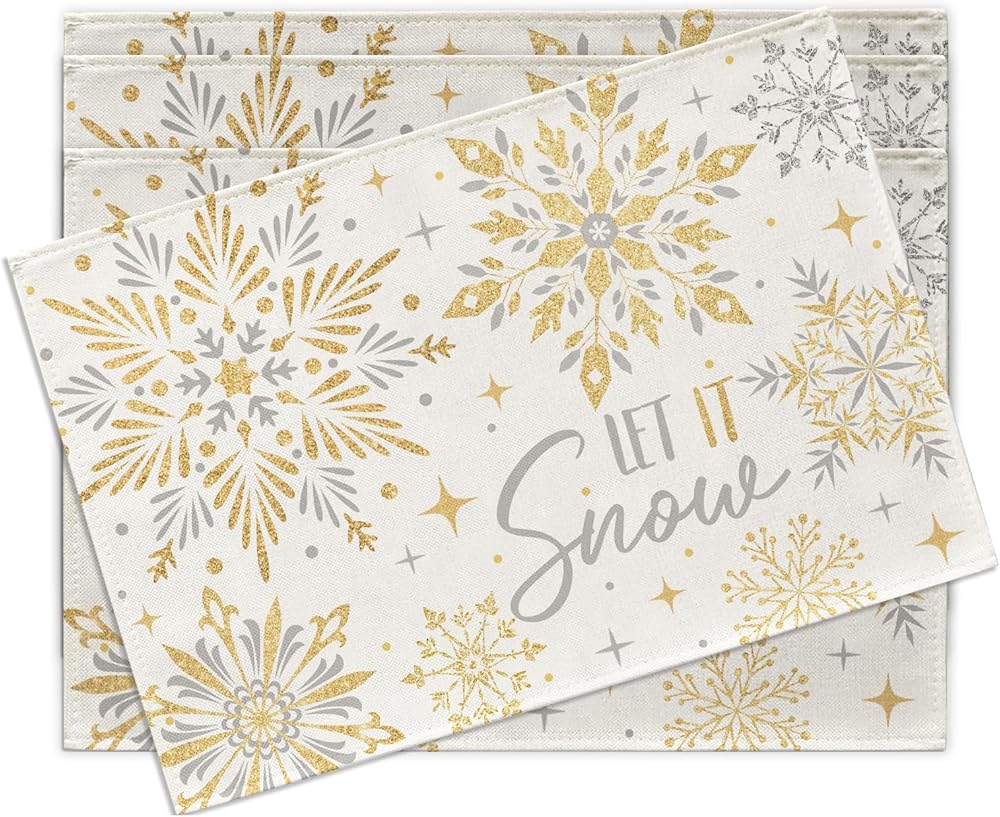 Winter Gold Snowflake Placemats Set of 4, Golden Grey Let It Snow Glitter Dining Place Mats Table Decor, Christmas Seasonal Home Kitchen Decoration 12 x 18 Inches