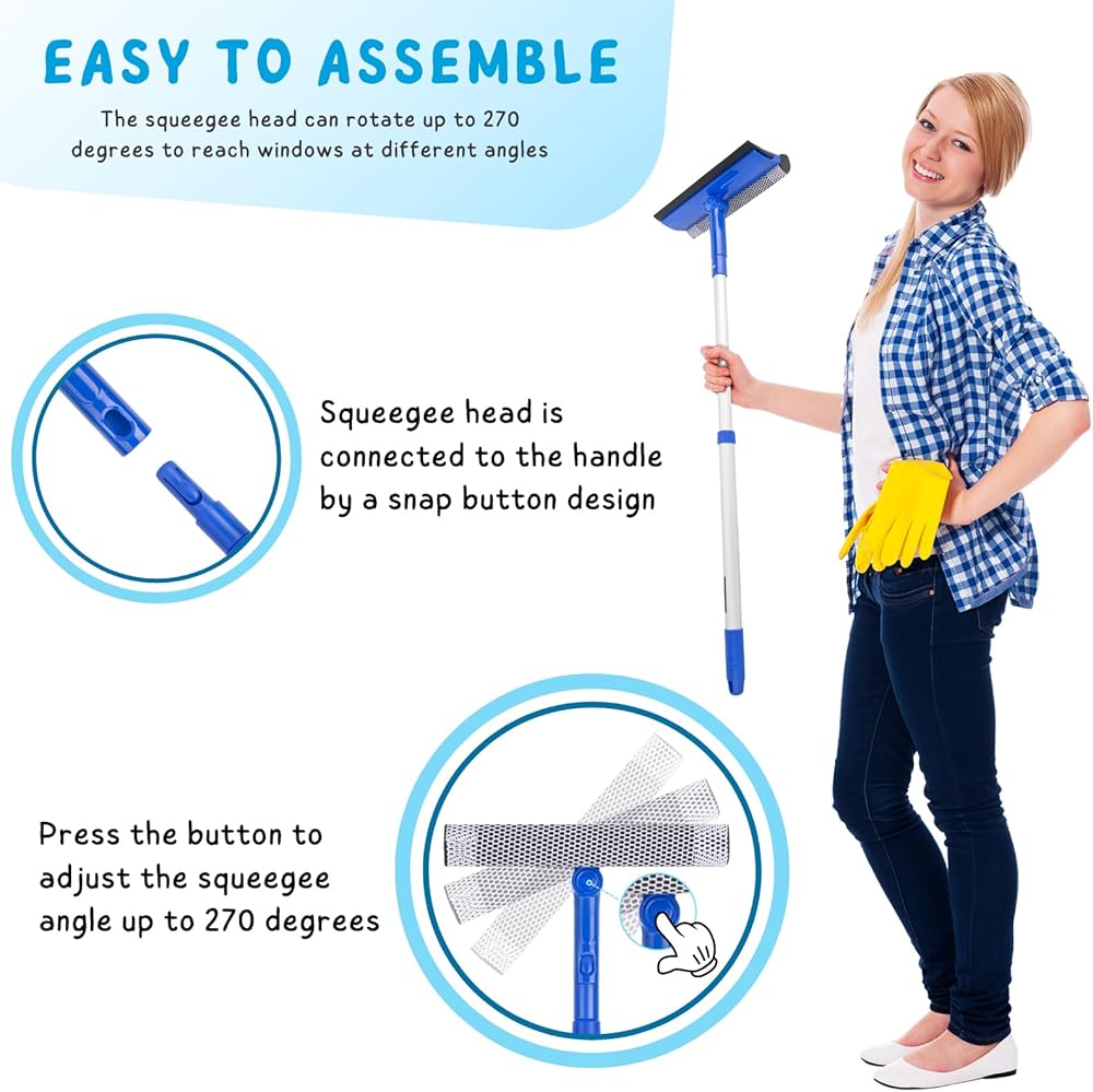 【Reach High Windows with Ease】 This window washer features a sturdy steel handle that can be adjusted in length from 29 inches to 56 inches by removing or adding sections to suit windows of different heights, and it includes an additional hand-held handle for ground-level window or car windshield cleaning.(Note: Package contains only one squeegee head.)