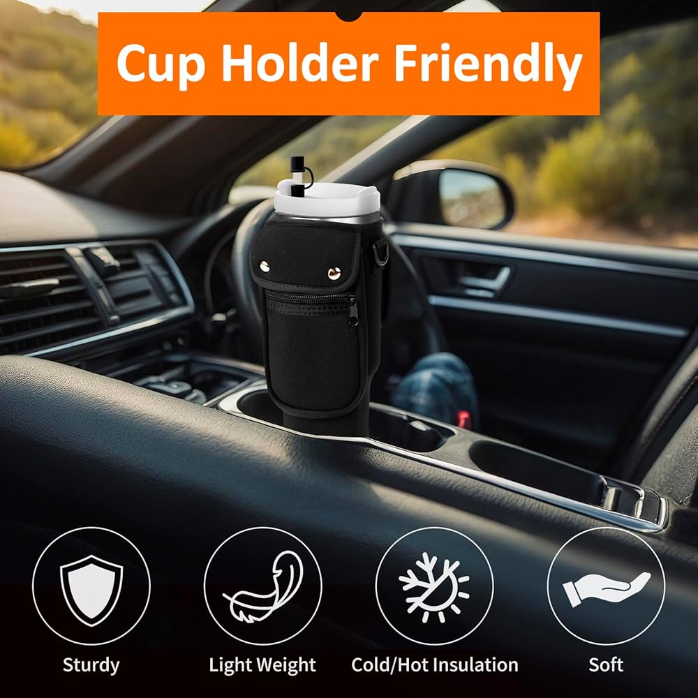 Water Bottle Carrier Bag with Phone Pocket for Stanley 40/30 oz Tumbler Neoprene Insulated Mug Sleeve Pouch with 2 Pockets & Adjustable Strap & Straw Cover for Stanley Cup Accessories
