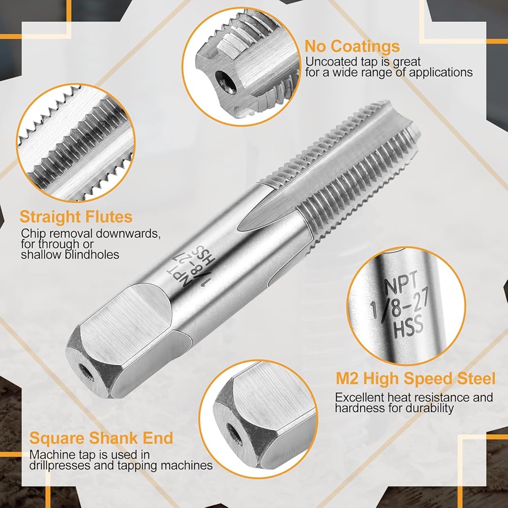Usage for Taps: Our NPT thread design taps create strong, leak between pipes or fittings, ensuring reliable performance in plumbing, automotive, and construction. For ideal results, use with threading oil and tap holders with overload protection