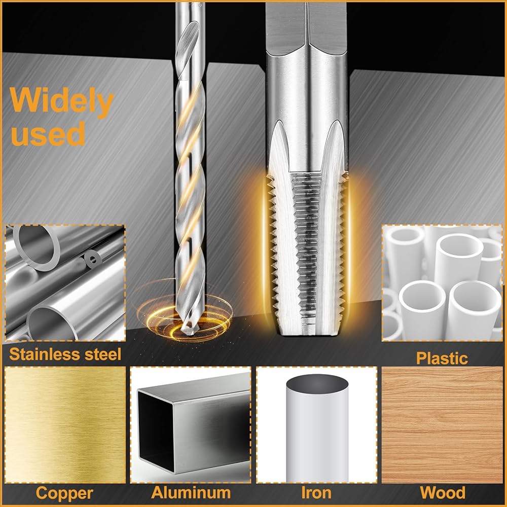 Precision: The taps come with precision ground threads, right cutting type, round shanks, square heads, and four straight slots, all designed for accurate and efficient thread processing. The drill bit features a spiral chip removal design, clutter chip removal
