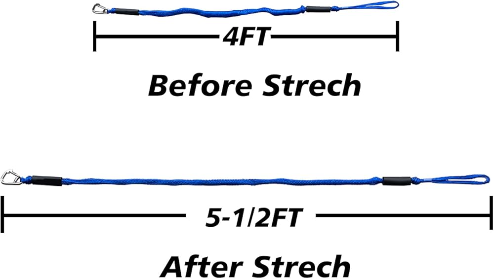 Dimensions: The bungee portion measures approximately 4 feet long when relaxed, allowing for ample stretch and tension adjustment. And they can strenth to 5 1⁄2 feet.
