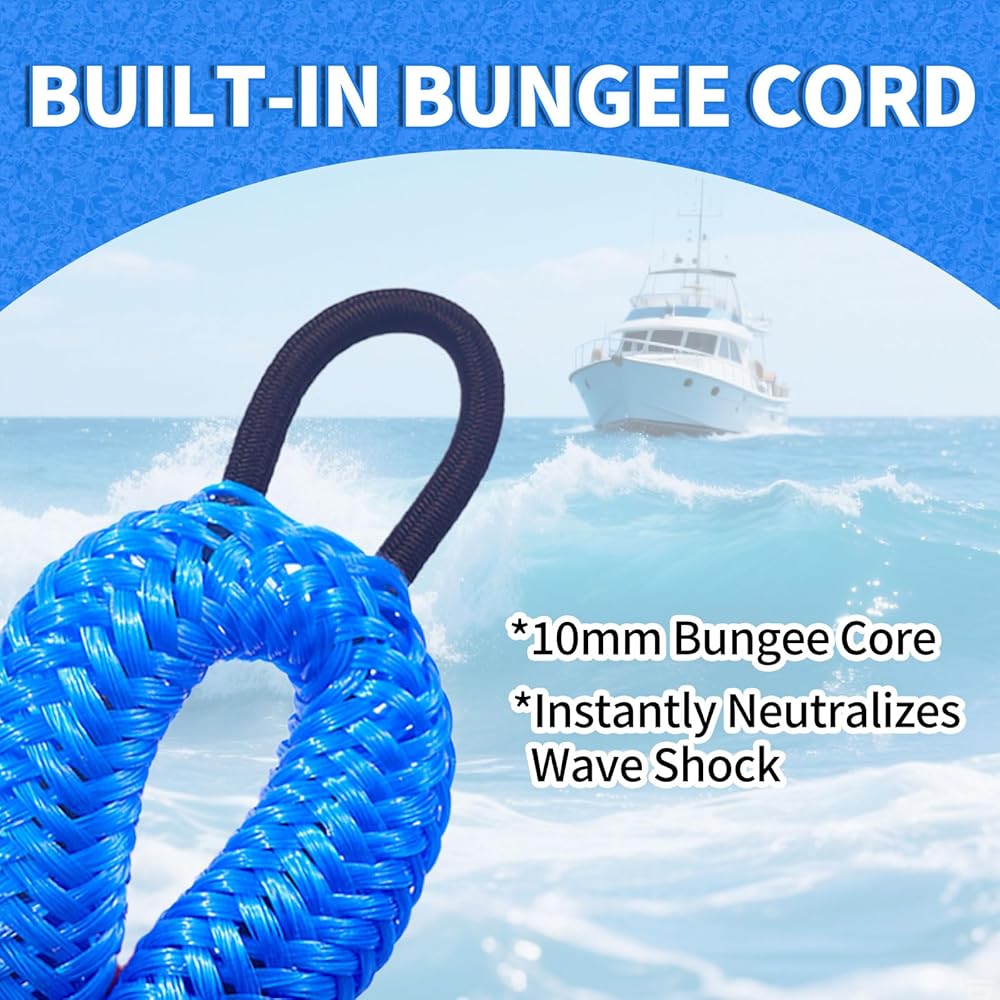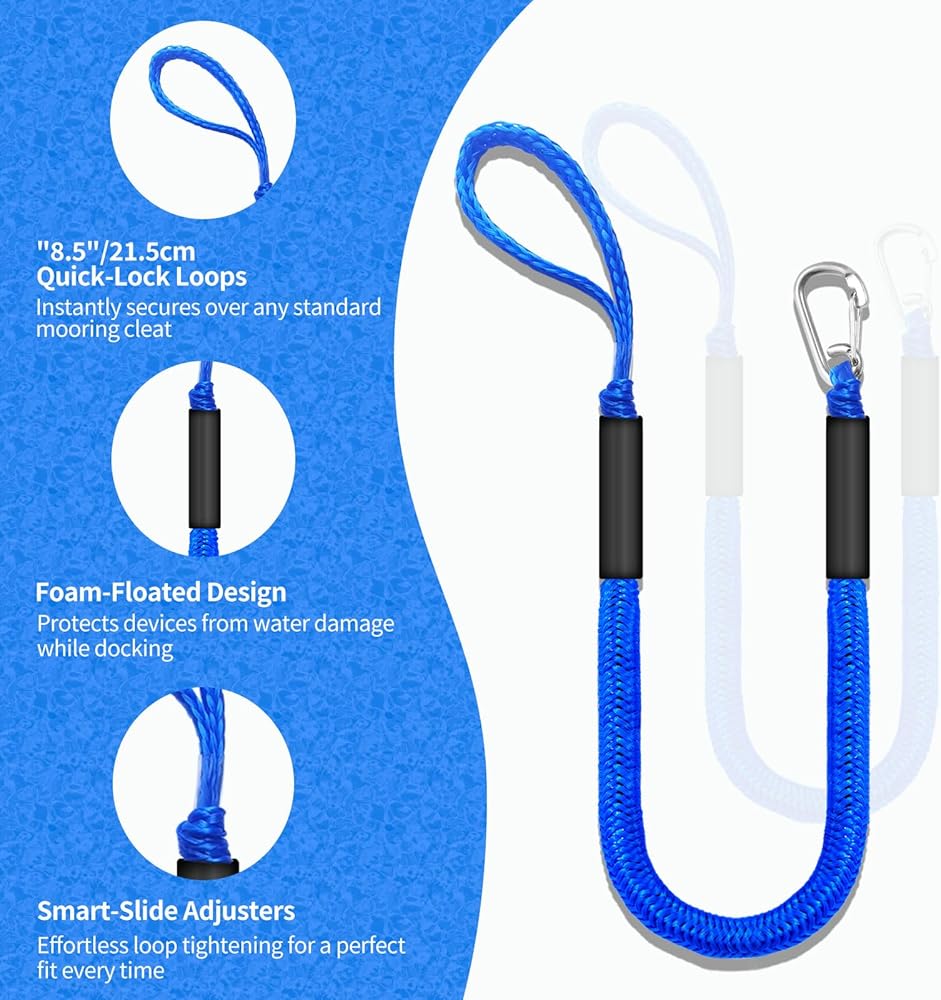 Boat Bungee Dock Lines 4ft (Stretches to 5.5ft) with Shock-Absorbing Latex Core, Foam Floats, and Heavy-Duty PE Braided Rope – Easy Docking for Boats, Kayaks, Jet Skis, Pontoons and More