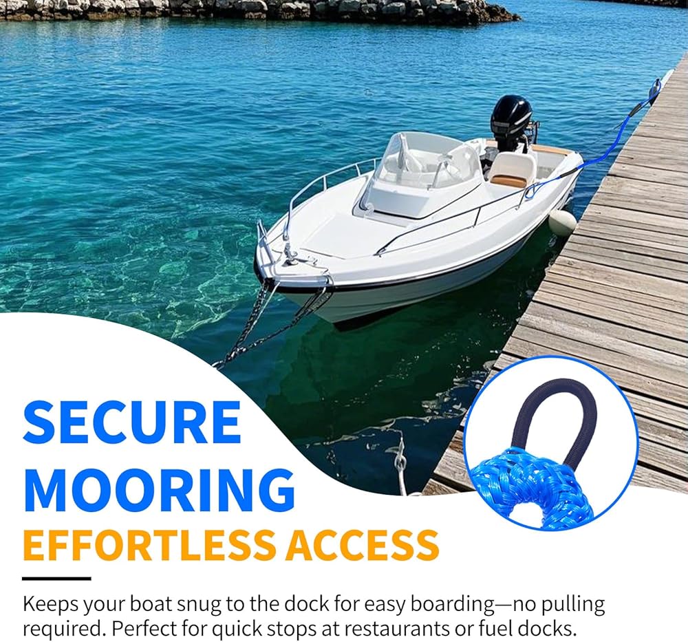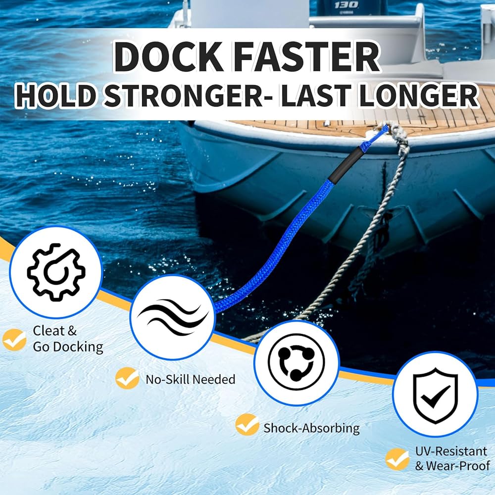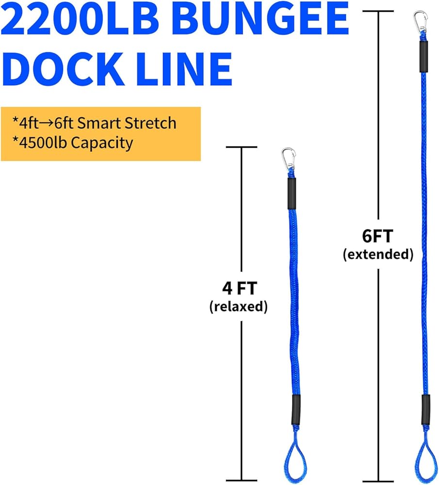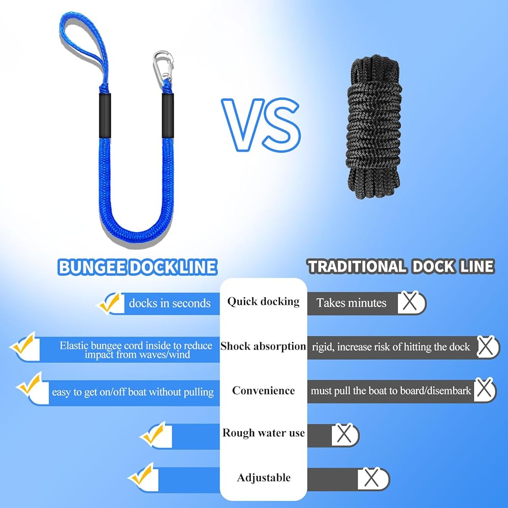 Versatile: This set of 2 bungee dock lines with carabiners is ideal for securing boats, kayaks, canoes, and other watercraft. The Boat Bungee Dock Lines absorb shock to boats, cleats, docks, pylons, and other hardware.