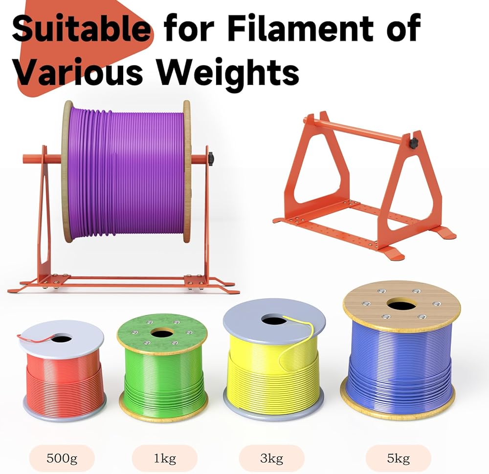Adjustable Base Design: This 3D printer filament holder suitable for 500g, 1kg, 3kg, 5kg filaments, suitable for all printers. The base is designed with multiple adjustable holes, making it more convenient for you to use filaments of different sizes