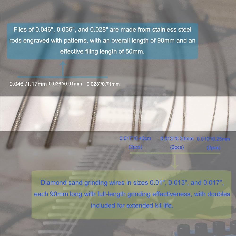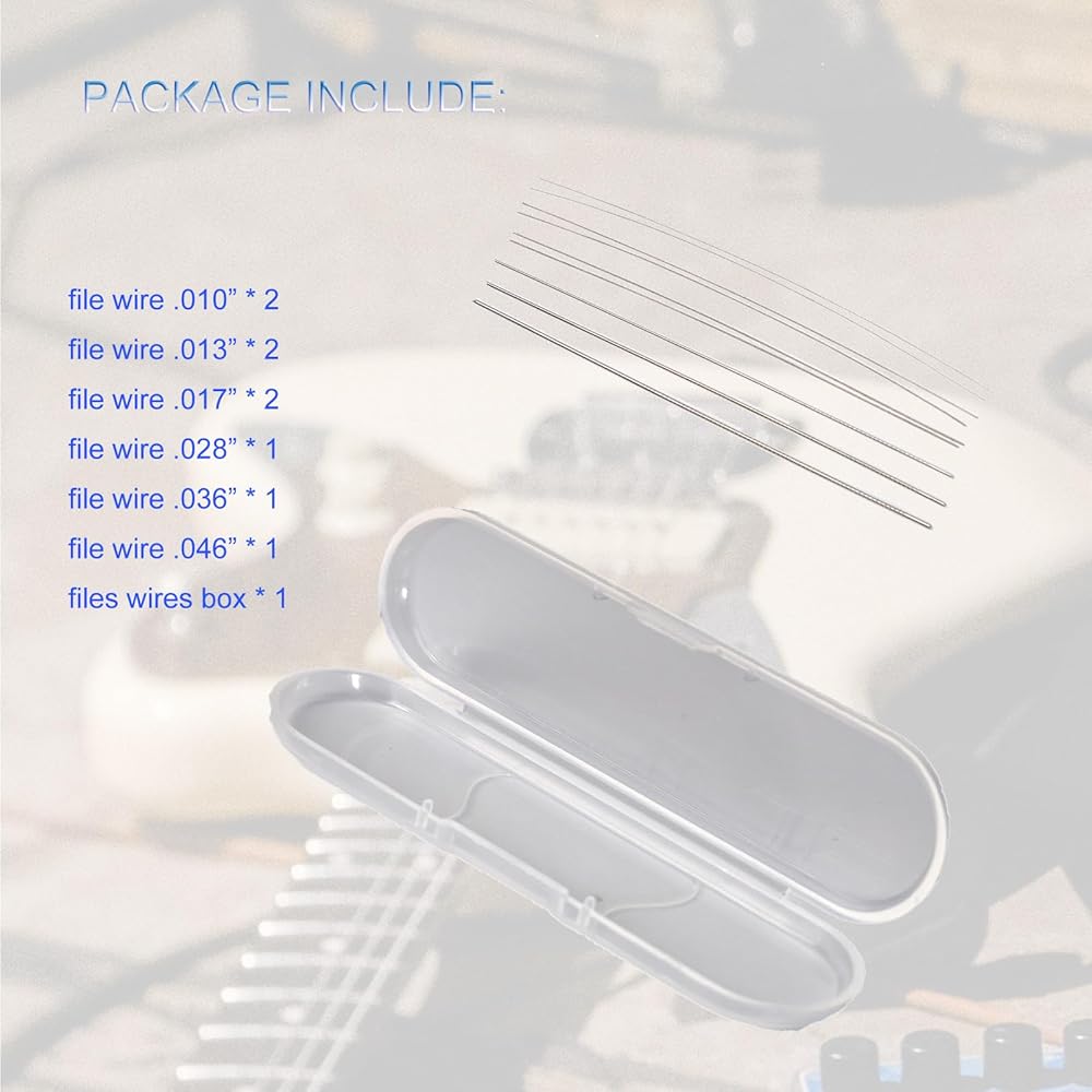 - 0.010" (2pcs), 0.013" (2pcs), 0.017" (2pcs), the filing wires are narrower, made with stainless steel coated in diamond for precision.