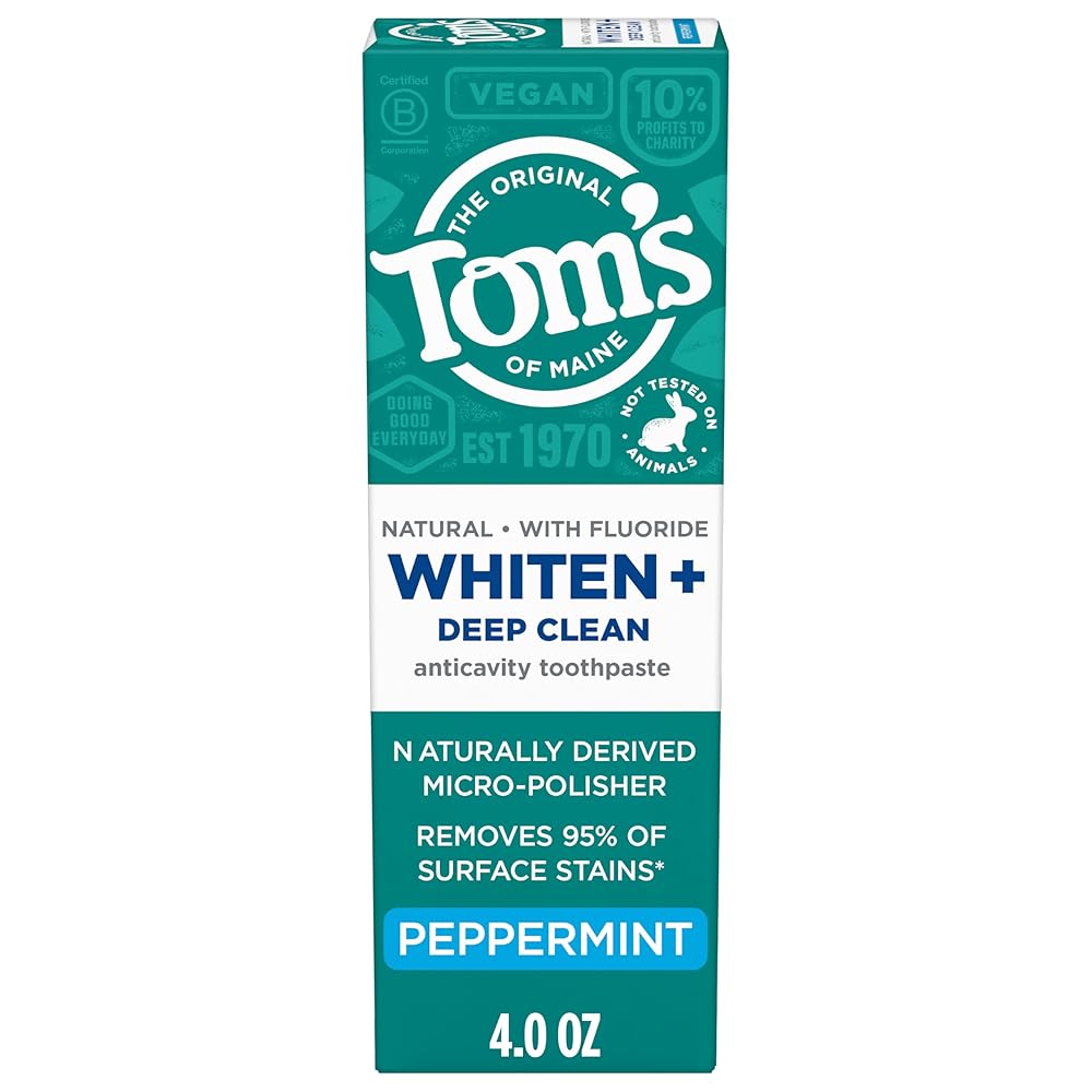 Discover a whiter, brighter smile with tom's of maine whiten plus deep clean whitening toothpaste. This natural enamel safe teeth whitening toothpaste is specially formulated to help whiten without causing sensitivity. In addition, tom's of maine whiten plus deep clean toothpaste removes up to 95% of surface stains* to help you reveal a brighter smile. Tom's of maine whiten plus deep clean toothpaste with fluoride doubles as an anticavity toothpaste and has ingredients that are clinically shown to prevent stains. This minty vegan toothpaste is formulated with plant-based cleansers and naturally derived micro-polishers that help gently polish your teeth and prevent new stains from occurring. This whitening fluoride toothpaste contains no peroxide, sls, artificial flavors, or artificial dyes and is not tested on animals so you can feel good about how you take care of your oral care every time you brush. Choose tom's of maine whiten plus deep clean anticavity toothpaste for an enamel safe natural whiter smile. *after 2 weeks of twice daily use.