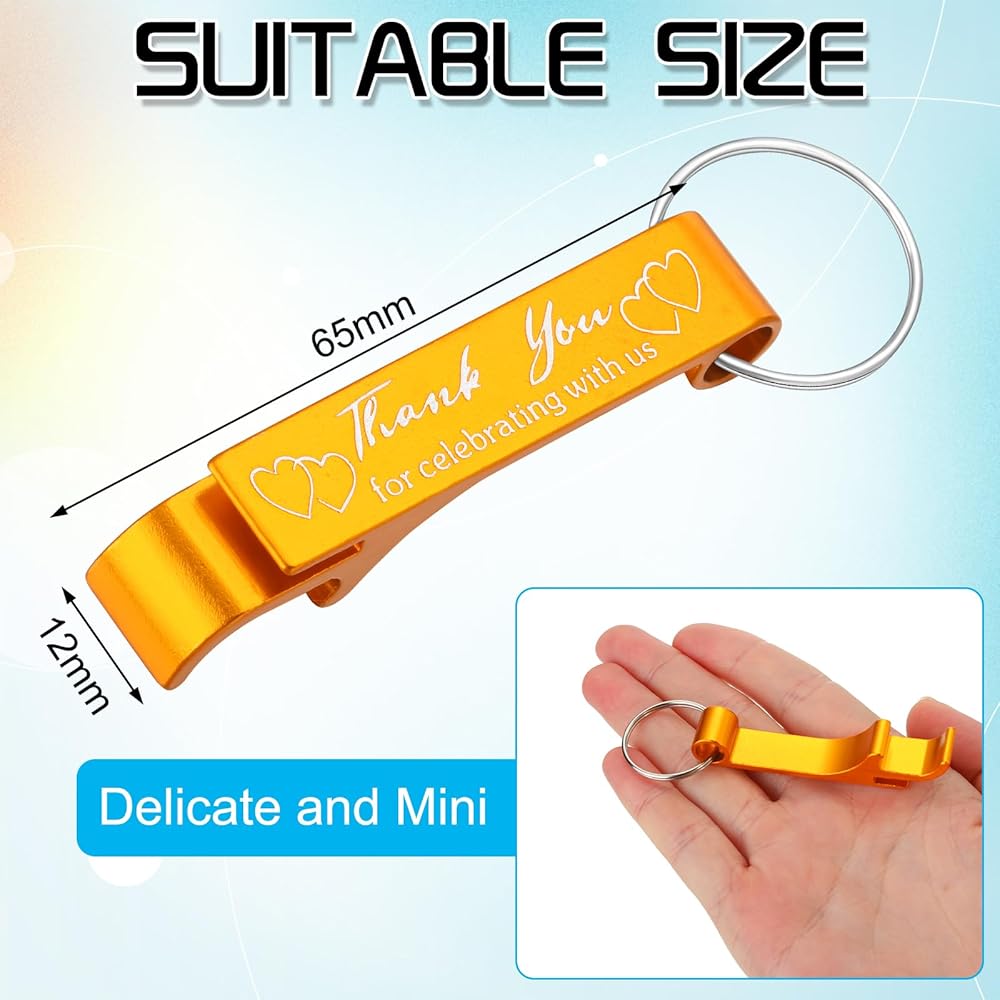 Suitable Size: the bottle opener wedding favors are delicate and mini, which measures approx. 2.48 x 0.47 inches/ 6.3 x 1.2 cm, easy to carry and store, suitable for most drink bottles at parties; The keychain ring also comes in a reasonable size for you to hang on different kinds of bags or put into pockets