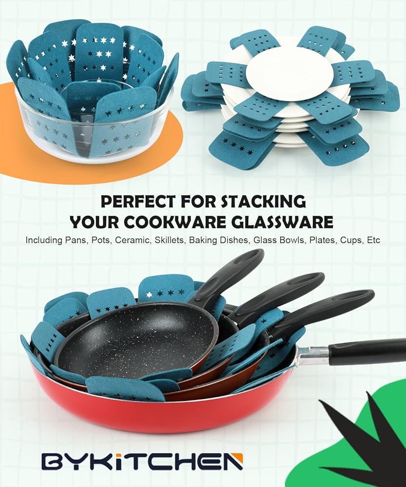 STACKING PAN PROTECTOR FOR SPACE SAVING: Great use for stacking your cookware, glassware, bakeware, stoneware, ceramic, skillets, bowls, plates, cups and more, a must-have to save space in your kitchen