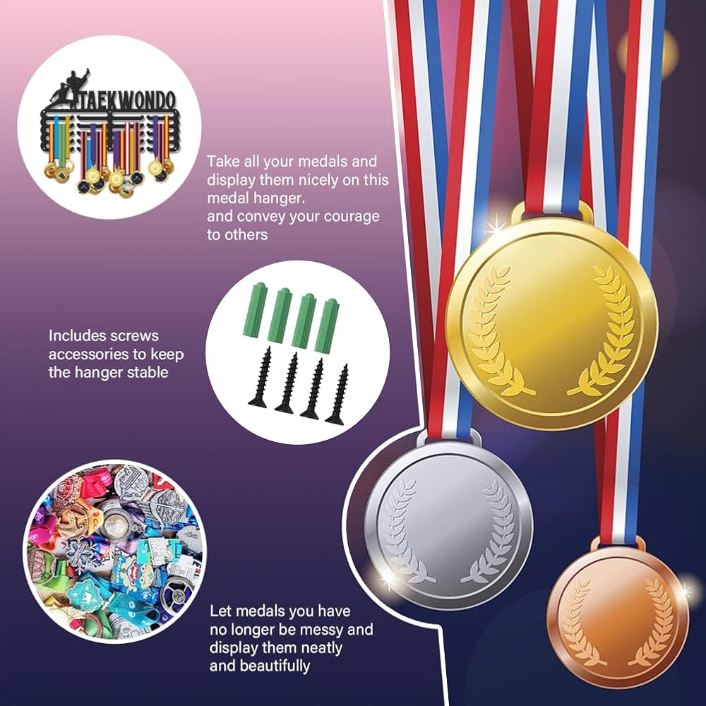 Wall Mounted Holders: This medal holder is equipped with screws and wall plugs to be mounted on walls, compared with self-adhesive hookers, it's much more durable and stronger in load-bearing capacity.