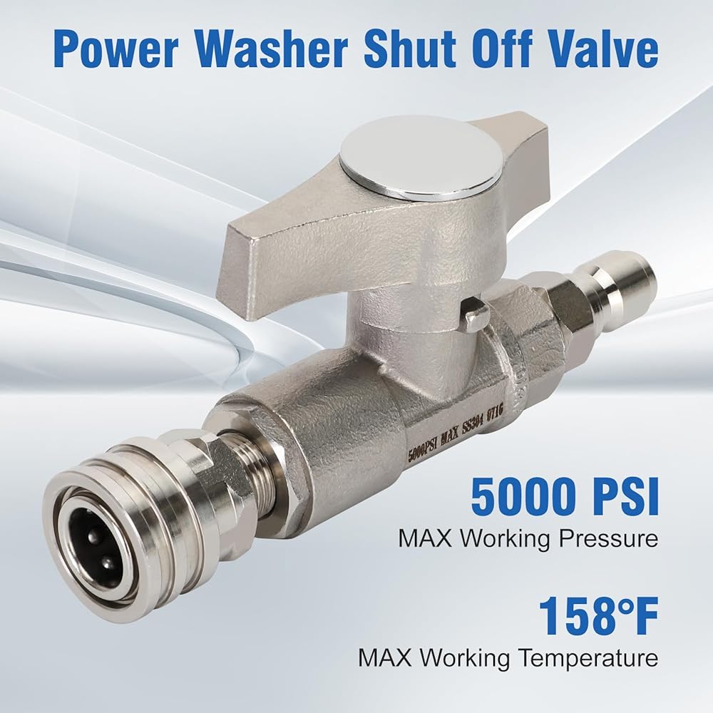 💧【Solid Structure】The power washer shut off valve is made of high quality plated brass for compactness, ruggedness, enhanced rust and corrosion resistance for long-term use with no concern. The high pressure ball valve can reach a maximum working pressure of 3000 PSI and a maximum working temperature of 176 degrees Fahrenheit.