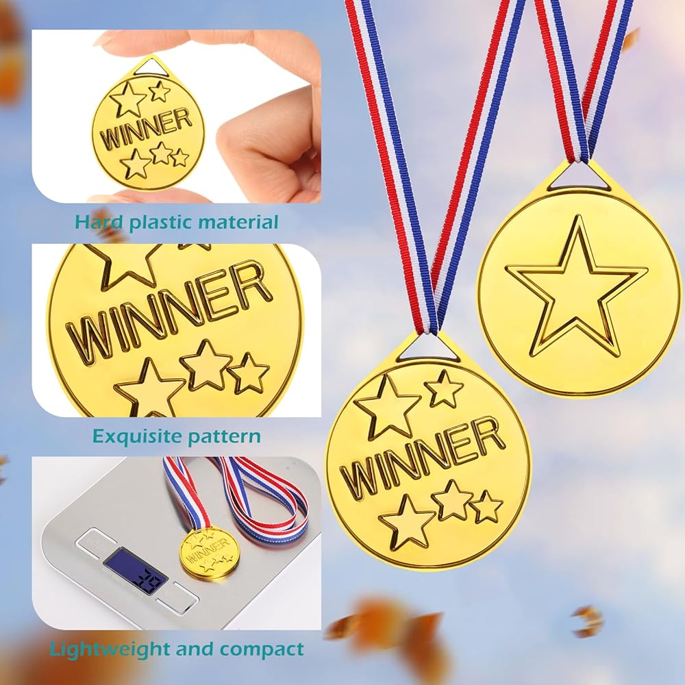 Package includes: 30pcs gold plastic medals for you, enough for you to use at various place like parties, festivals, competitions, sports games and more.each one is in gold-tone design with a ribbon.