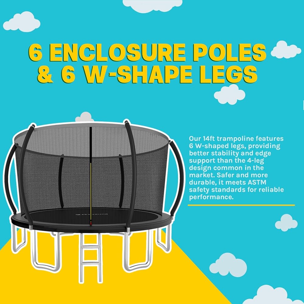 FULLY PADDED FOR SAFETY: Each of our outdoor trampolines is made with a full foam padded perimeter along the mat to prevent contact with springs as well as padding on every outer pole. The net enclosure secures to make sure you remain on the trampoline at all times! The ultra-stable base uses 5 long w-shaped legs designed to prevent rocking and base movement. This trampoline for kids and adults also features a ladder for easy access and safe exits.