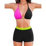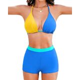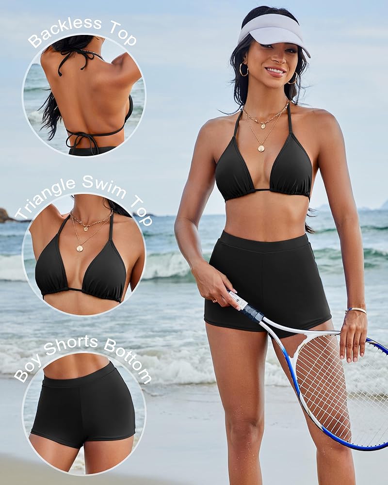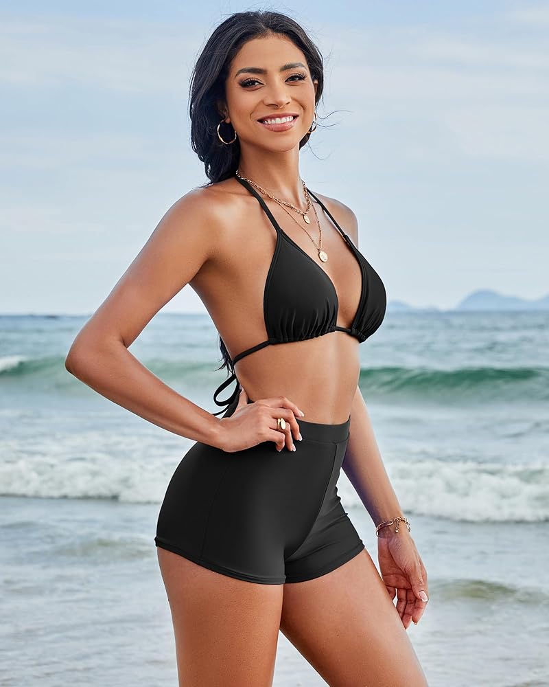 Feature-Womens two piece swimsuits with shorts. Sexy triangle top. Adjustable Spaghetti straps. Halter neck, Removable padded. Tie back. High waisted shorts. Tummy control and good coverage bottom