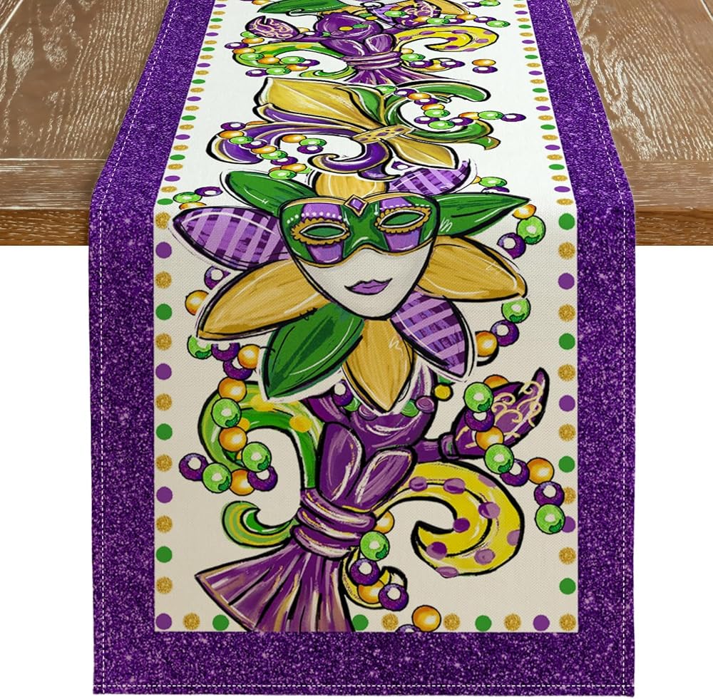 ARKENY Mardi Gras Table Runner 72x13 Inches Fleur De Lis Mask Beads Purple Carnival Table Decor, Burlap Farmhouse Indoor Outdoor Holiday Decoration for Home Party