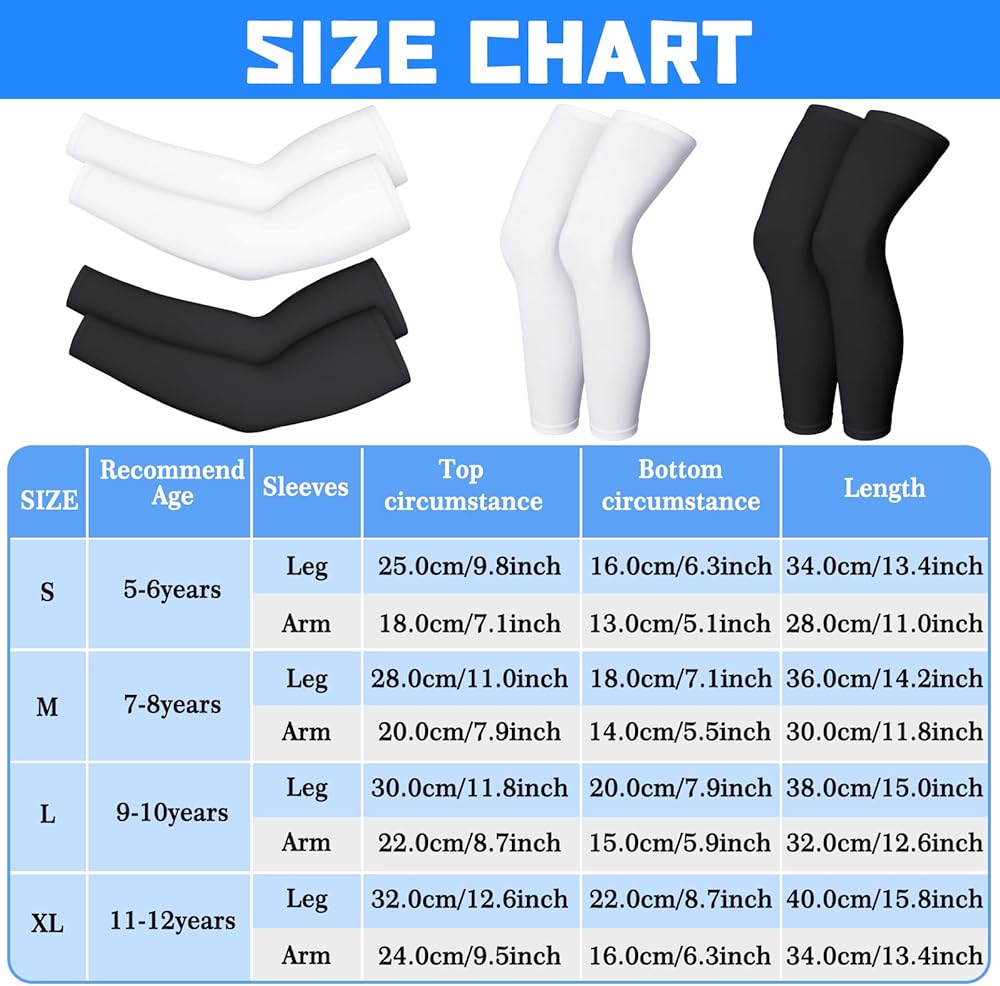 Nice Combination: the package comes with 2 pairs of black and white compression leg sleeves, 2 pairs of black and white arm sleeves, a total of 4 pairs, 8 pieces; These knee and arm covers are enough to meet your child's daily needs and replacement