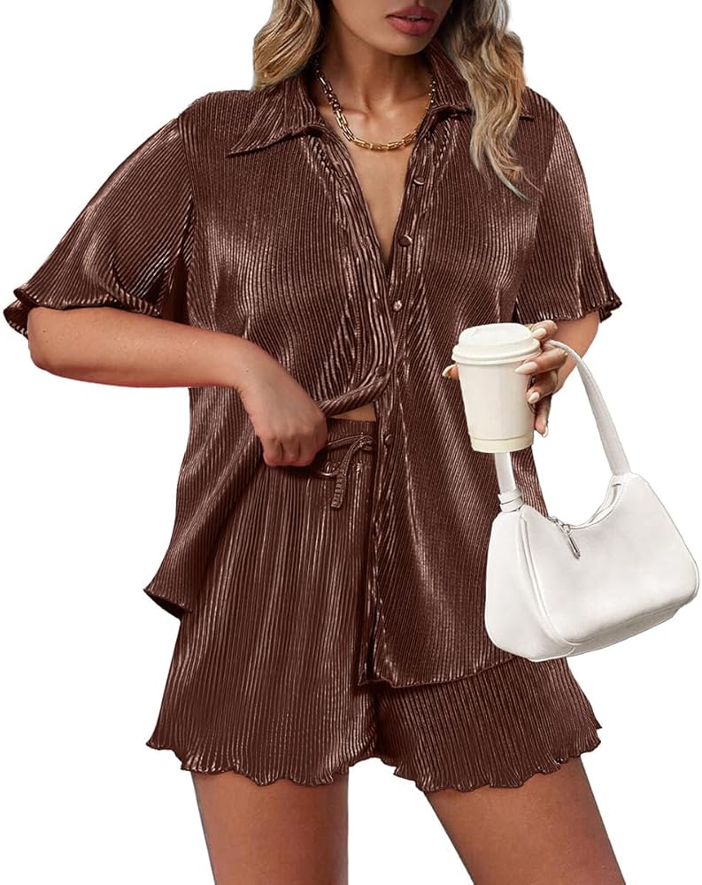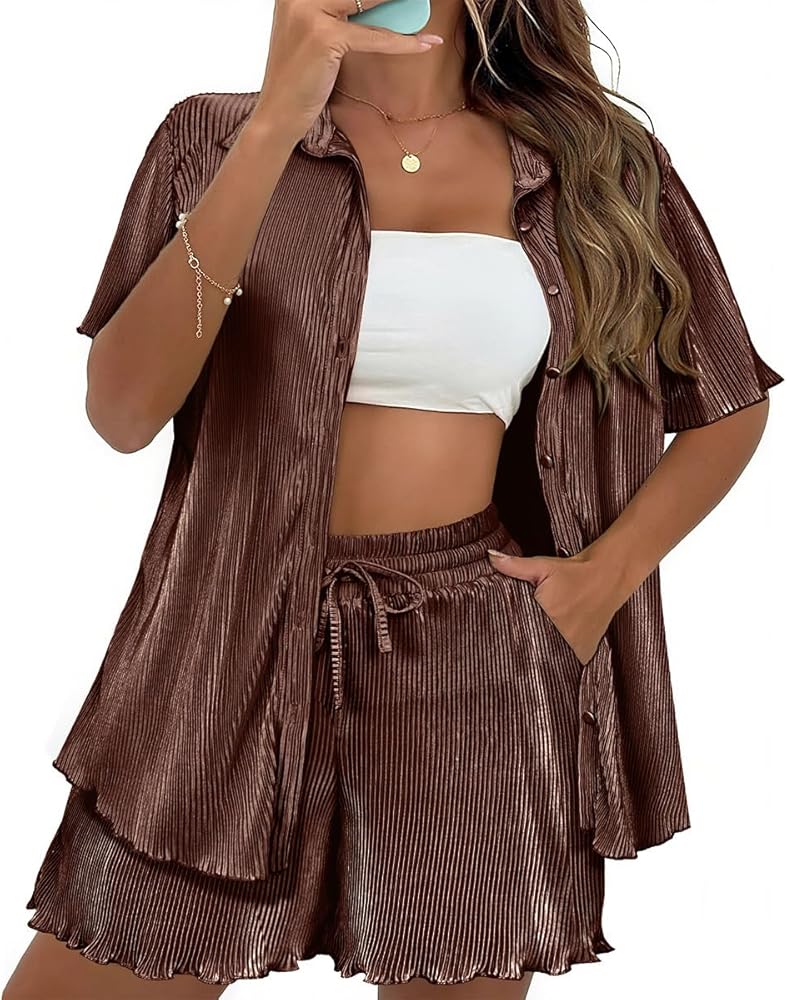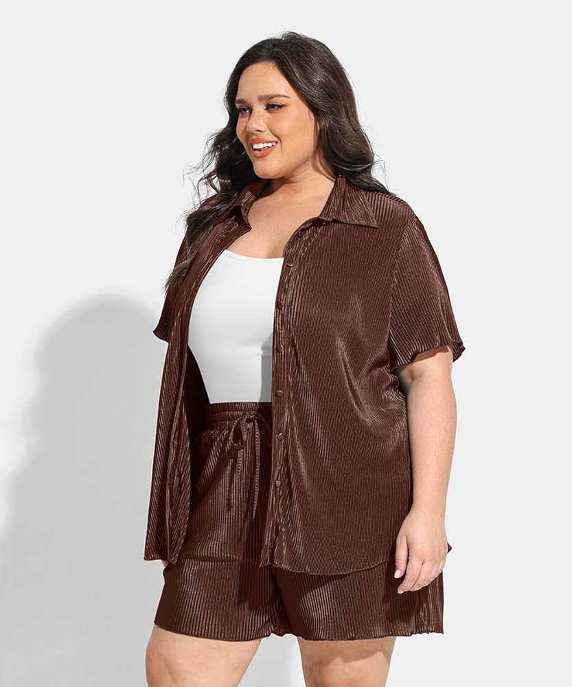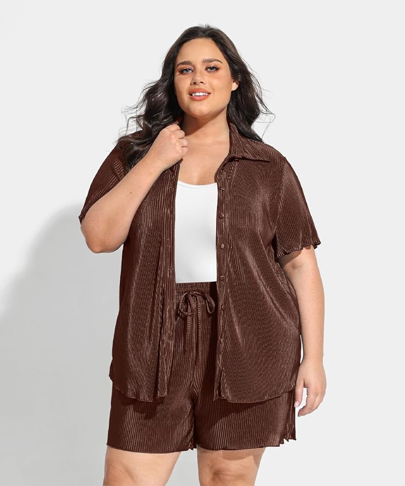 This plus size women's 2 piece outfit, available from XL to 5XL, is crafted from high-quality polyester fiber, offering a soft, breathable, and stretchy fabric that's gentle on the skin. The set includes a button down shirt with a stylish pleated design and matching wide leg shorts that boast a high elastic waistband, providing a chic yet comfortable fit suitable for most body shapes. Combining vintage and streetwear styles, this versatile set allows each piece to be worn separately, making it ideal for various occasions, from casual outings and office wear to vacations and lounging at home.