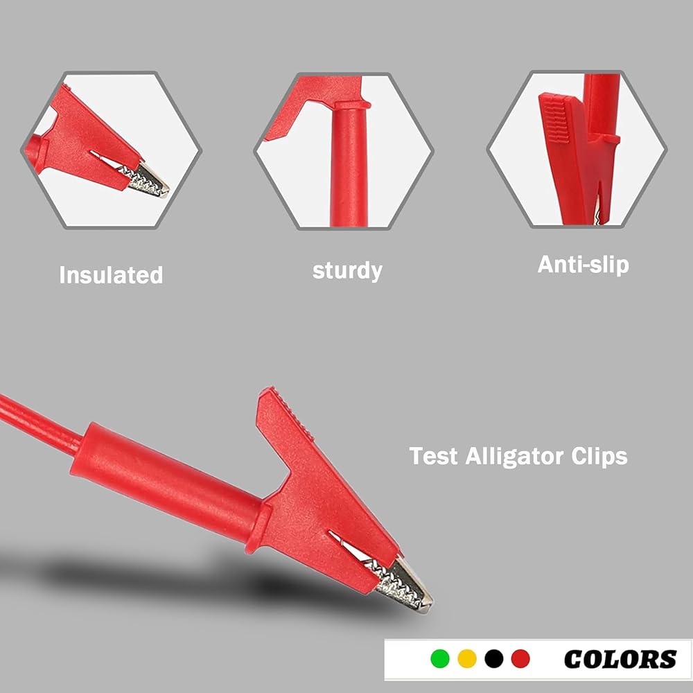 【Material】: : Banana to alligator clip test cable with heat resistant insulated silicone jacket, solid copper PVC shell cable wire, alligator clips with built-in strong spring. Better grip and conductivity.