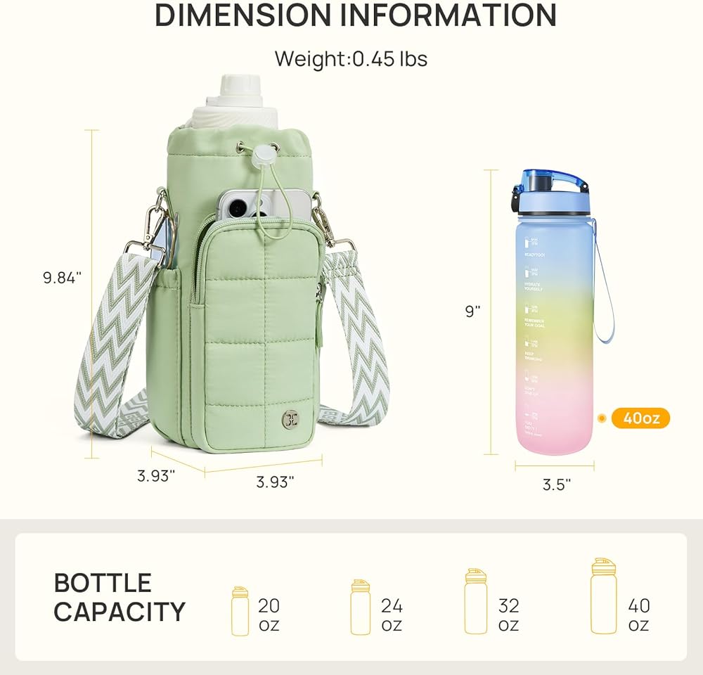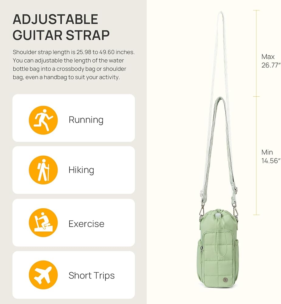 Specifications: The size of Telena water bottle carrier bag is 3.93" x 3.93" x 9.84" (L x W x H). This cross body water bottle bags come with adjustable straps ranging from 25.98 " to 49.60" in length, which you can freely adjust to suit your activity