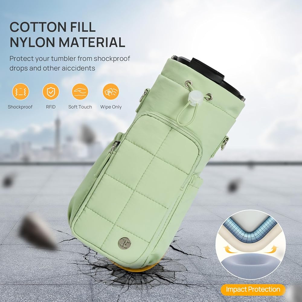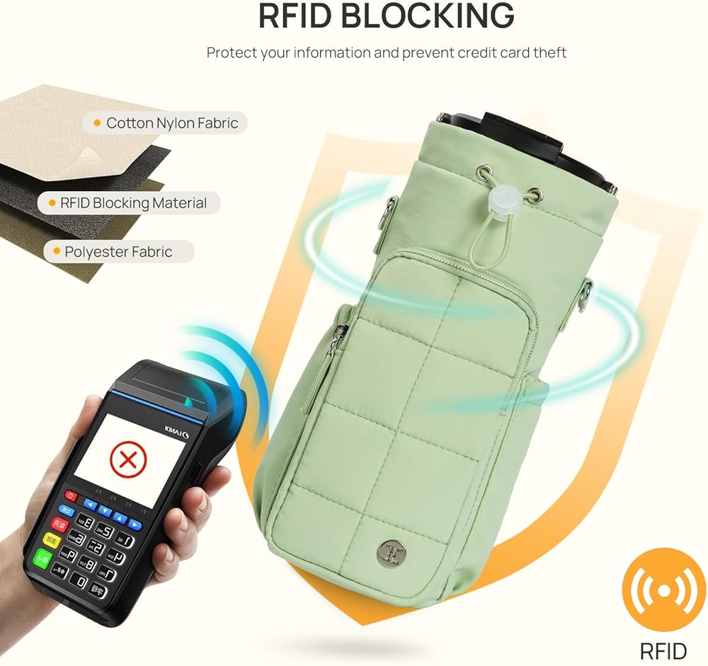 Multi-pocket Design: Telena water bottle holder not only holds the water bottle, but also comes with 3 pockets and 4 card slots to hold the items you need for your daily outing. The front zipper pocket is large enough to hold your phone, headphones, lipstick and more. And it has RFID function, so the internal 4 card slots protect the card from being stolen while storing the card. The height of the left and right insert bags has been upgraded to accommodate your sunglasses and hand cream