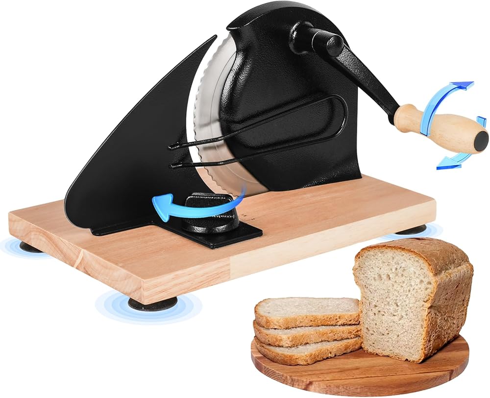 Upgraded Manual Bread Slicer for Homemade Sourdough Bread, Adjustable Thickness Hand Crank Bread Slicer with Stainless Steel Blade and Suction Cup, for Even Slicing, Kitchen & Bakery Use, Black
