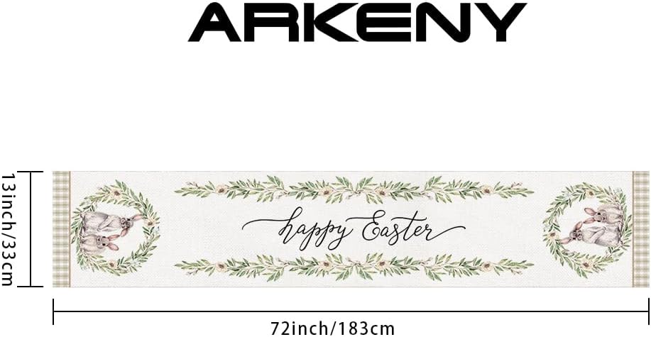 Introducing our Easter table runner, a must-have for your festive celebrations! Measuring 13 x 72 inches, this generously sized table runner offers versatile decorating options. Whether decorating your dining table or creating a stunning centrepiece, it will effortlessly enhance your Easter ambiance. Not limited to traditional use, our table runner offers versatile styling options. Use it as an eye-catching centrepiece to add a festive touch to your home decor. Enjoy the convenience of effortless care and maintenance with our easy-to-clean table runner. Designed to withstand everyday wear and tear, it can be machine washed to maintain its vibrant colours. But it's not all about style; our table runner also offers enhanced table protection. It acts as a practical barrier against spills and stains, keeping your table safe. Note that for heat protection, a heat resistant mat should be placed on top of the runner. At ARKENY we offer a wide range of Easter decorations and accessories. Explore our collection to find the perfect pieces to complement your table runner and placemats. Create a complete and cohesive look for your celebration and enjoy the abundance of choice.