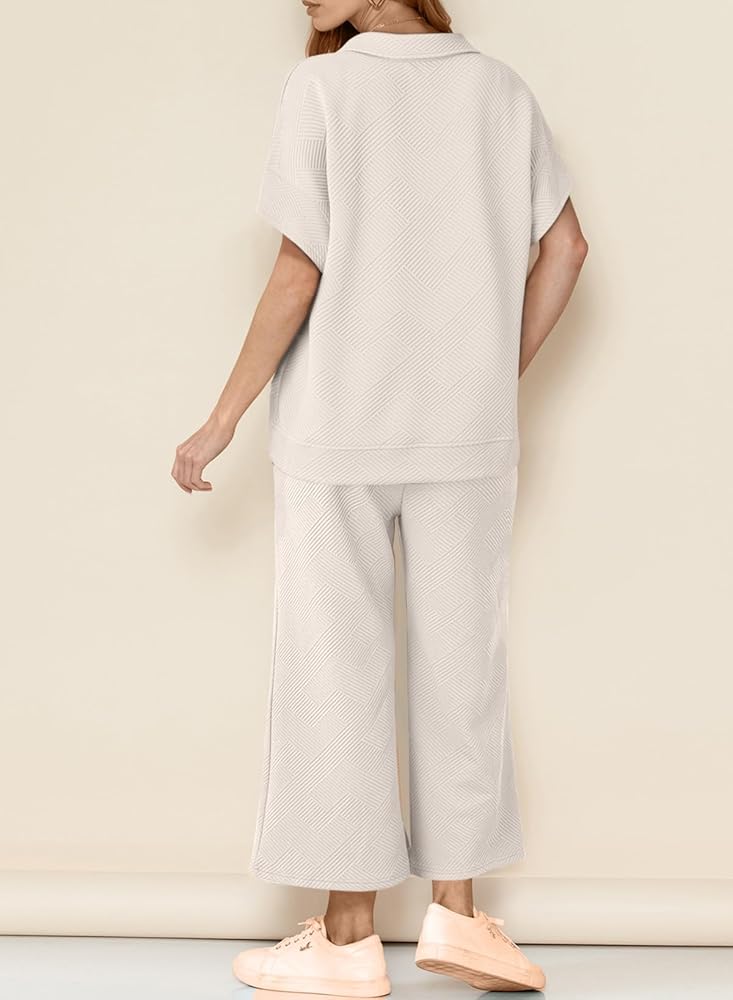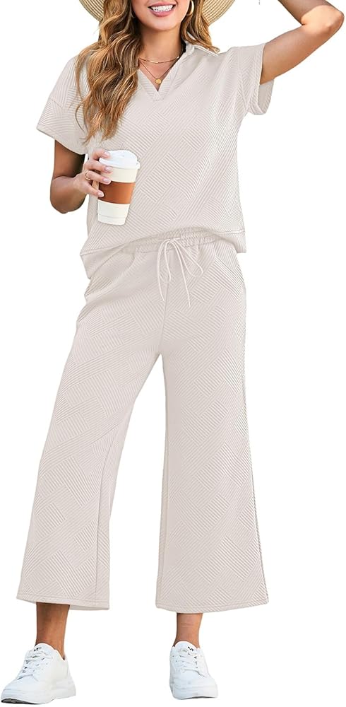 Feature: Two piece oufits, lounge sets, pajamas set, lapel collar, knit, short sleeve pullover top, drawstring high waisted pants, two pockets, solid color, create a relaxed and fashions louchy silhouette.
