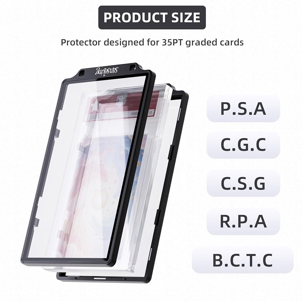 COMPATIBLE WITH:Designed specifically for PSA slabs, our graded card protector offers reliable protection against everyday wear and tear. It is also compatible with standard-sized slabs from CGC, CSG, and AGS, providing versatile protection for a range of graded cards