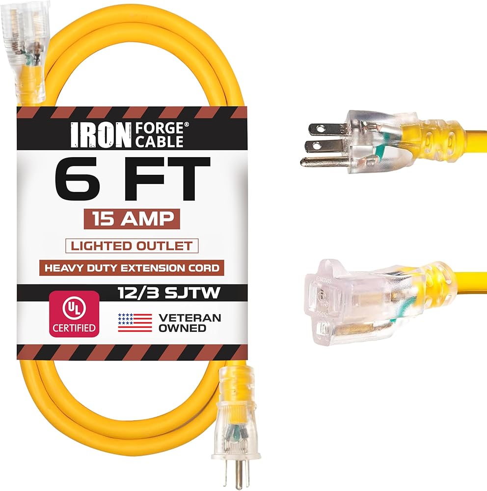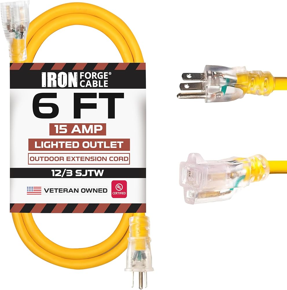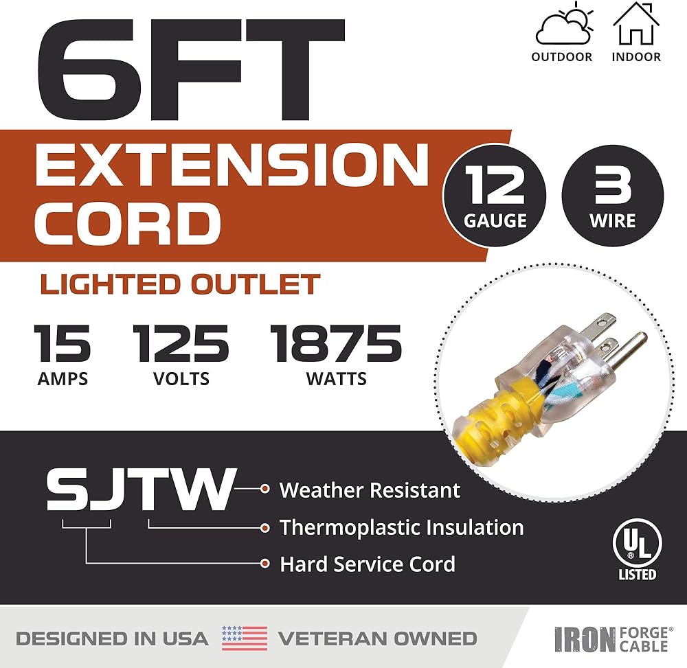 IRON FORGE CABLE 6 Foot Lighted Outdoor Extension Cord - 12/3 SJTW Heavy Duty Yellow Extension Cable with 3 Prong Grounded Plug for Safety, 15 AMP - Great for Garden and Major Appliances